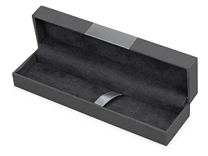 Футляр для ручки изготовлен из прочного картона с матовым покрытием, имитирующим кожу. Декоративная серебристая вставка придаёт футляру премиальный вид. Внутренняя часть отделана велюром, на котором ручка фиксируется при помощи атласной ленты. - Футляр для одной ручки или механического карандаша. - Максимальная длина вложения - до 17 см. Гравировка (оптоволоконный лазер) (Без чернения) на данный товар осуществляется бесплатно. Оплачивается только настройка оборудования в размере 1000 рублей на весь тираж.