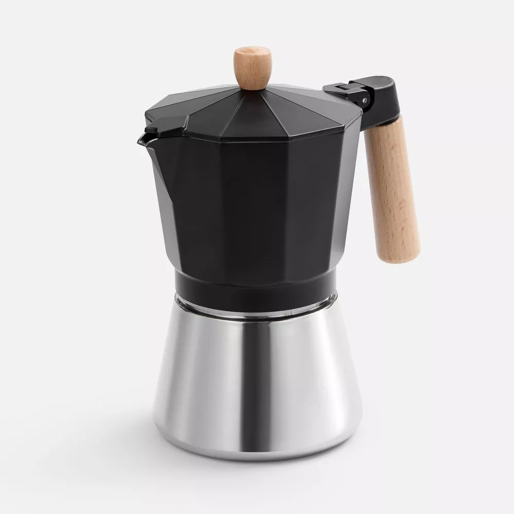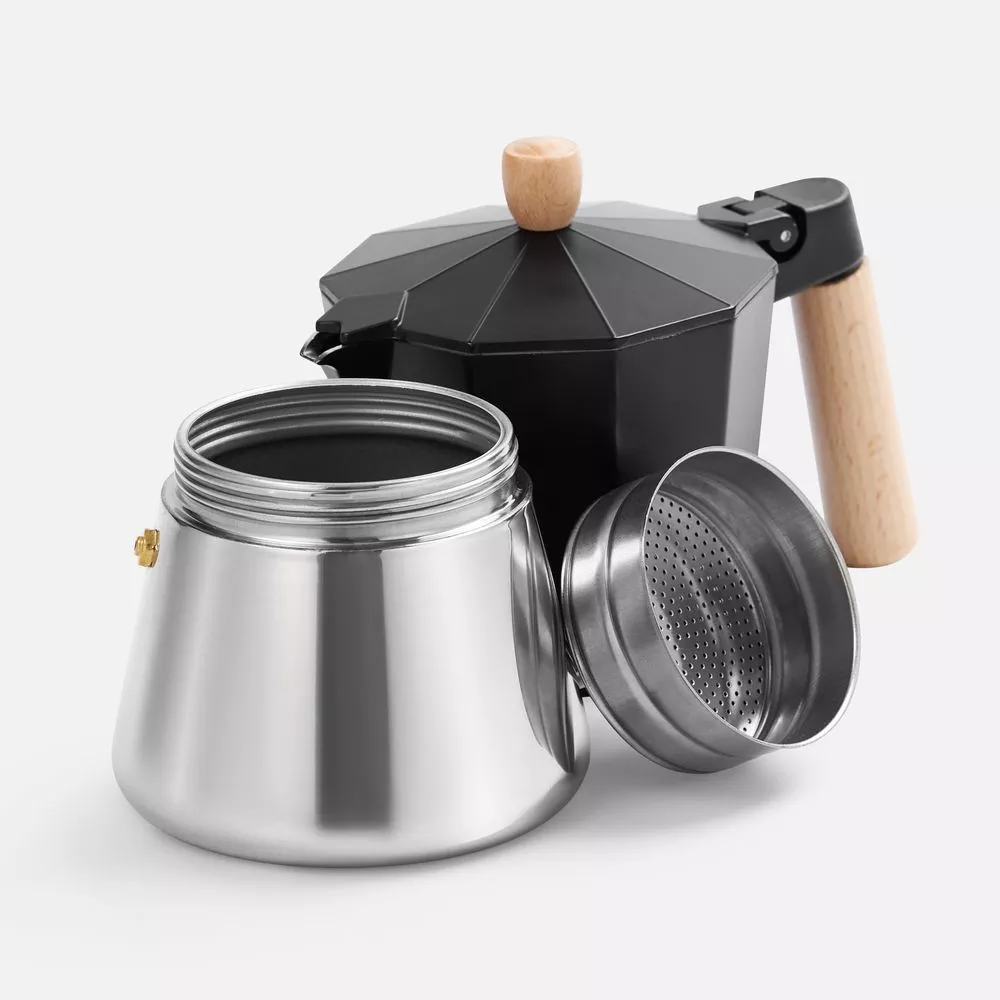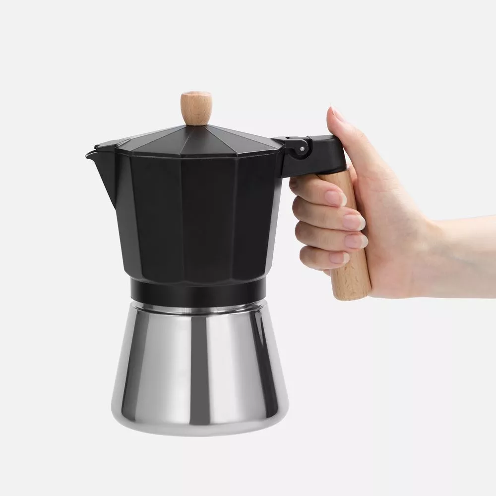 Верхняя часть выполнена из окрашенного алюминия, а нижняя — из нержавеющей стали с зеркальной полировкой, что обеспечивает долговечность и стильный внешний вид. Удобная деревянная ручка не нагревается, гарантируя комфорт и безопасность при использовании. Эта кофеварка быстро и легко приготовит классический эспрессо, позволяя сполна наслаждаться свежим крепким кофе.