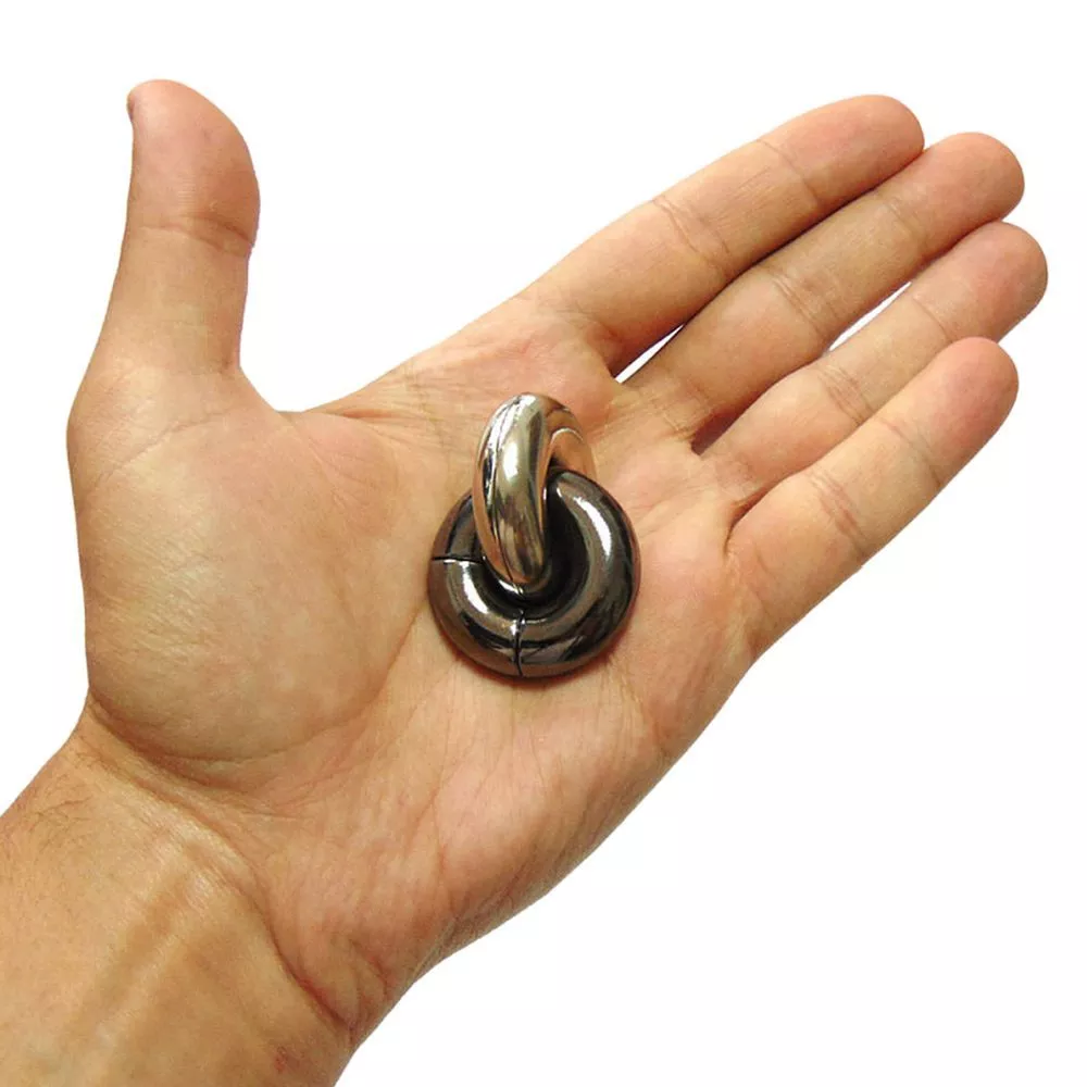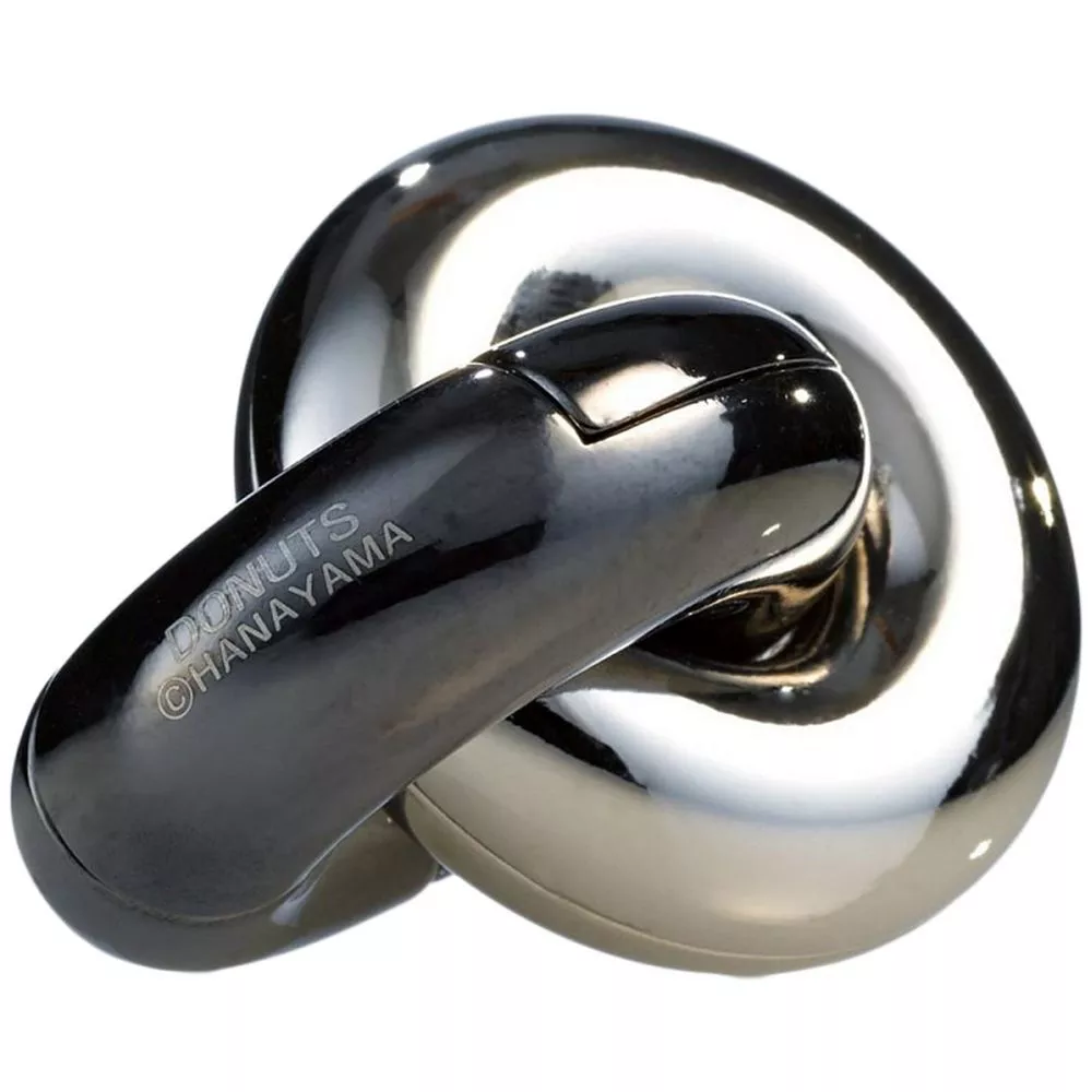 Красивая металлическая головоломка Donuts похожа на два соединенных между собой пончика. Необходимо отделить один от другого, а потом снова соединить их вместе.