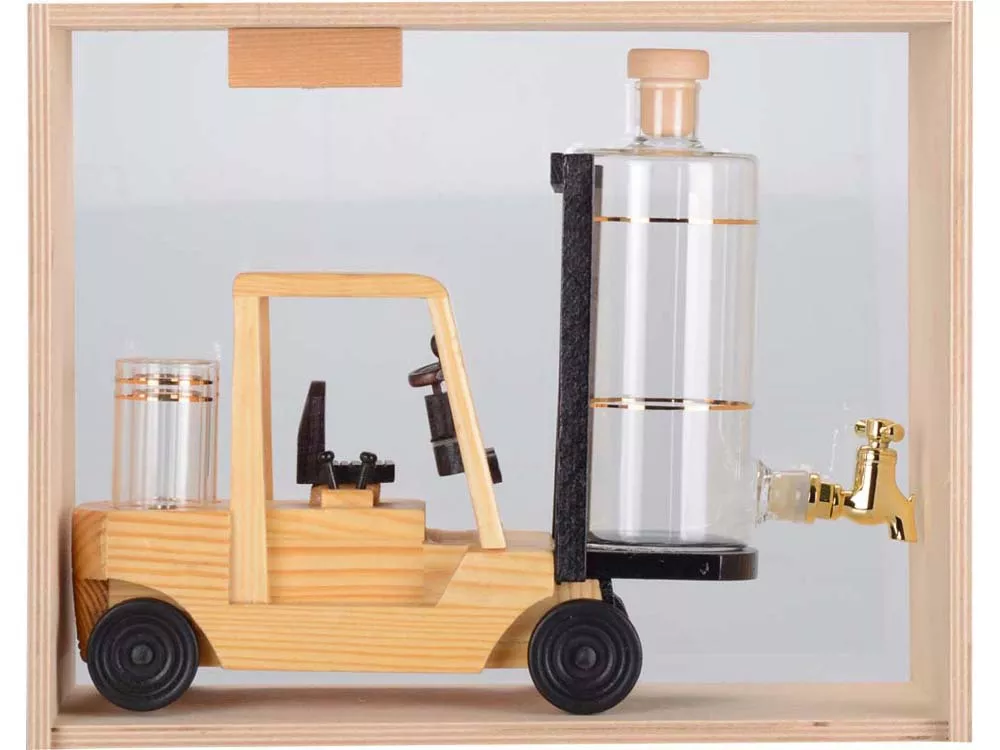 Креативный подарок для руководителей транспортных, производственных и торговых компаний. Графин для виски с краном и подставкой в форме погрузчика оснащен двумя стопками. Набор позволит разрядить обстановку и отметить достижения в узком кругу.