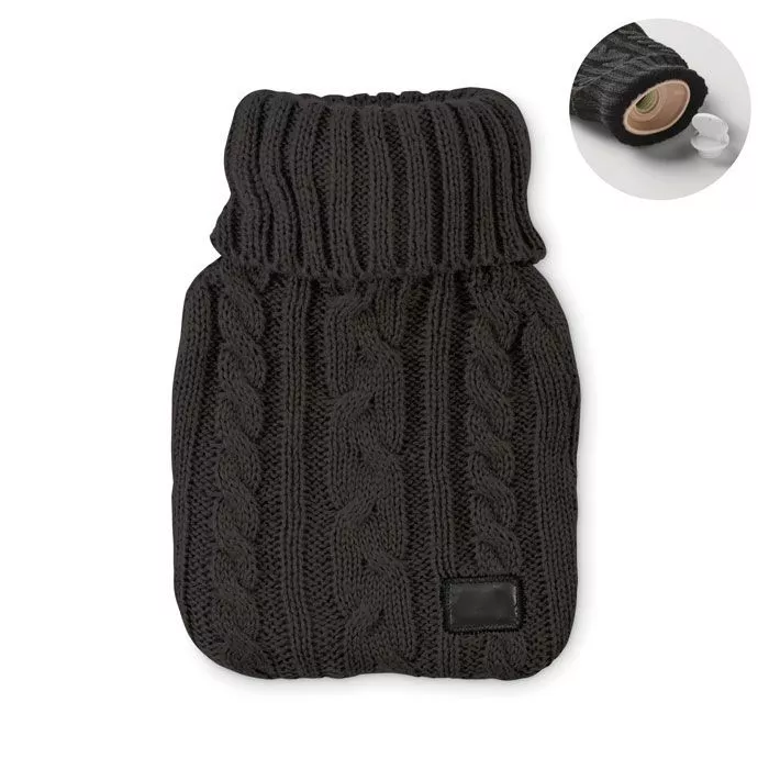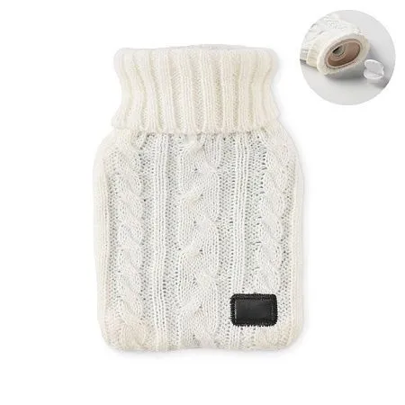 Hot water bottle with knitted acrylic pouch. Used to provide warmth, typically whilst in bed, but also for the application of heat to a specific part of the body. Capacity: 400 ml.