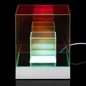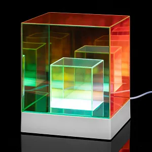 Cubini — интерьерный светильник с разноцветной подсветкой и удивительным эффектом оптических иллюзий. Разные оттенки граней и множественные отражения мгновенно притягивают взгляд и заставляют рассматривать кубик снова и снова.
