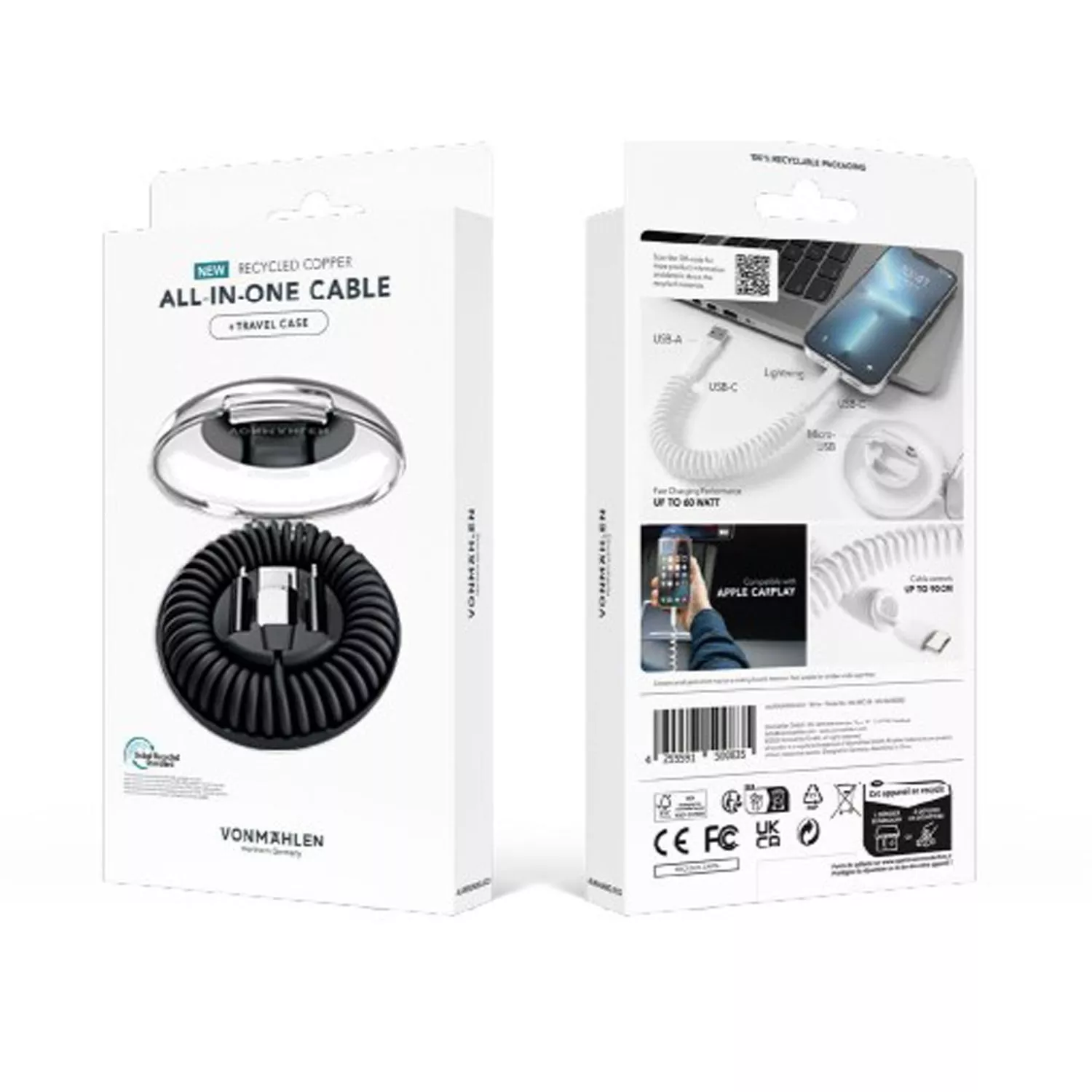 Универсальный кабель allroundo® eco 6 в 1 отличается компактными размерами и возможностью быстрой зарядки гаджетов. С его помощью можно не только зарядить, но и передать данные на устройство. Растягивается до 90 см, что обеспечивает большую свободу движений. Экологичное решение для ваших гаджетов: на 75% кабель состоит из переработанных материалов. Оснащен входом/выходом USB-C. В комплект входят адаптеры USB-A, Micro-USB и Lightning, поэтому кабель подходит для всех современных устройств.