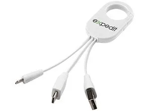 Кабель для зарядки 3-в-1. Кабель для зарядки Troop 3-в-1 с коннектором USB Type C и двойным совместимым коннектором 2-в-1 для устройств Apple® iOS и Android. Кабель оснащен карабином для удобного крепления к сумке. АБС-пластик.