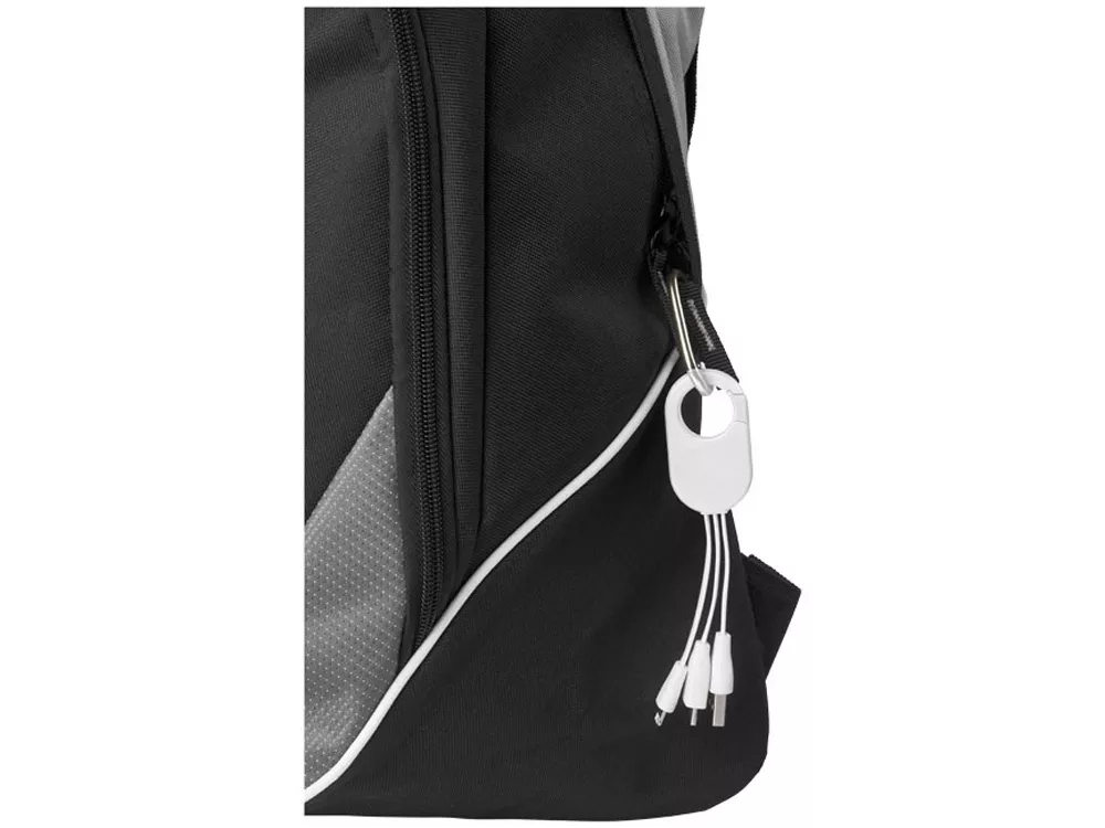 Кабель для зарядки 3-в-1. Кабель для зарядки Troop 3-в-1 с коннектором USB Type C и двойным совместимым коннектором 2-в-1 для устройств Apple® iOS и Android. Кабель оснащен карабином для удобного крепления к сумке. АБС-пластик.