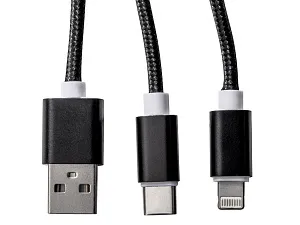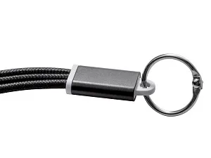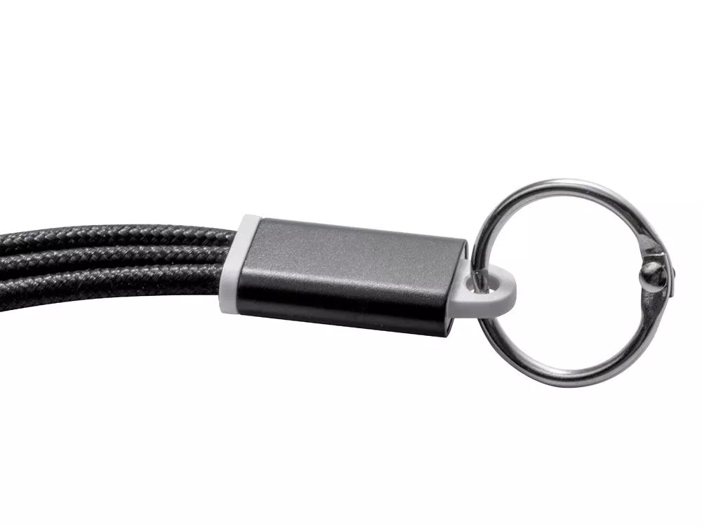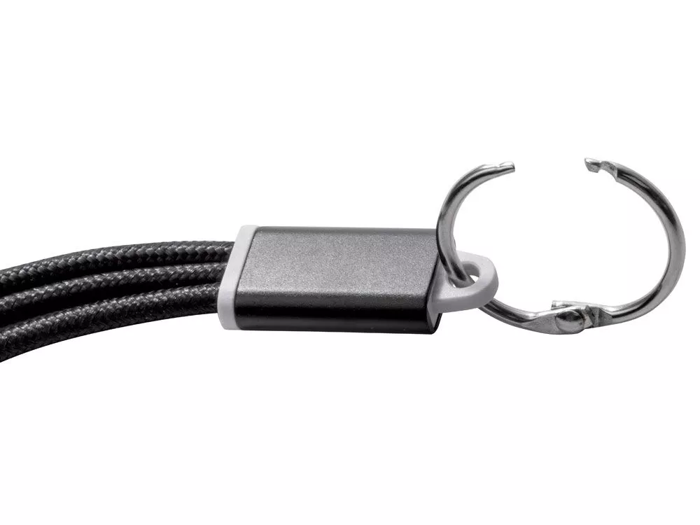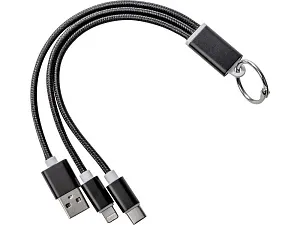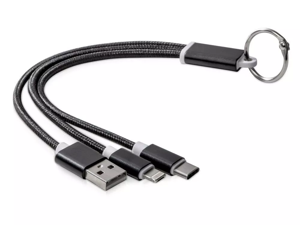 Кабель для зарядки Tres 3-в-1 с брелоком, коннекторами 1 type с, 1 USB type A и двойным совместимым коннектором 2-в-1 для устройств с ОС Apple® iOS и Android. В комплект входит брелок. Для зарядки устройств Apple подключайте кабель стороной без контактов; для зарядки устройств с ОС Android подключайте кабель стороной с контактами. Алюминий. Гравировка (оптоволоконный лазер) (Без чернения) на данный товар осуществляется бесплатно. Оплачивается только настройка оборудования в размере 950 рублей на весь тираж.