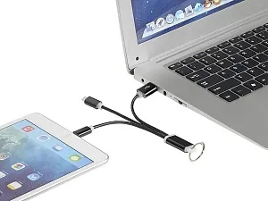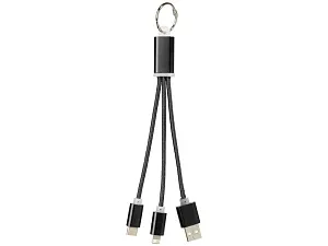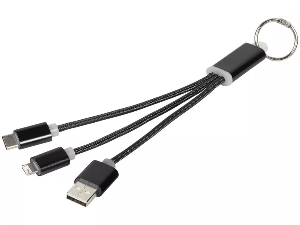 Кабель для зарядки Metal 3-в-1 с брелоком. Кабель для зарядки Metal 3-в-1 с брелоком. Кабель для зарядки Metal 3-в-1 с брелоком, коннекторами 1 type с, 1 USB type A и двойным совместимым коннектором 2-в-1 для устройств с ОС Apple® iOS и Android. В комплект входит брелок. Для зарядки устройств Apple подключайте кабель стороной без контактов; для зарядки устройств с ОС Android подключайте кабель стороной с контактами. Алюминий.