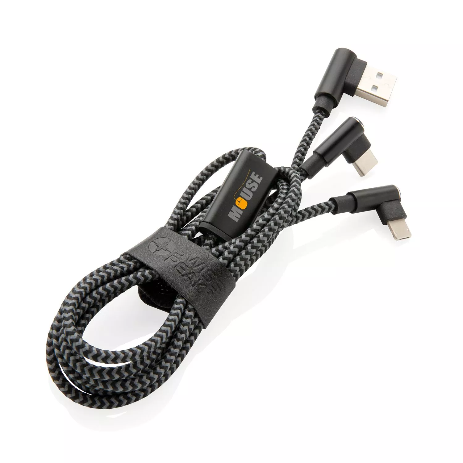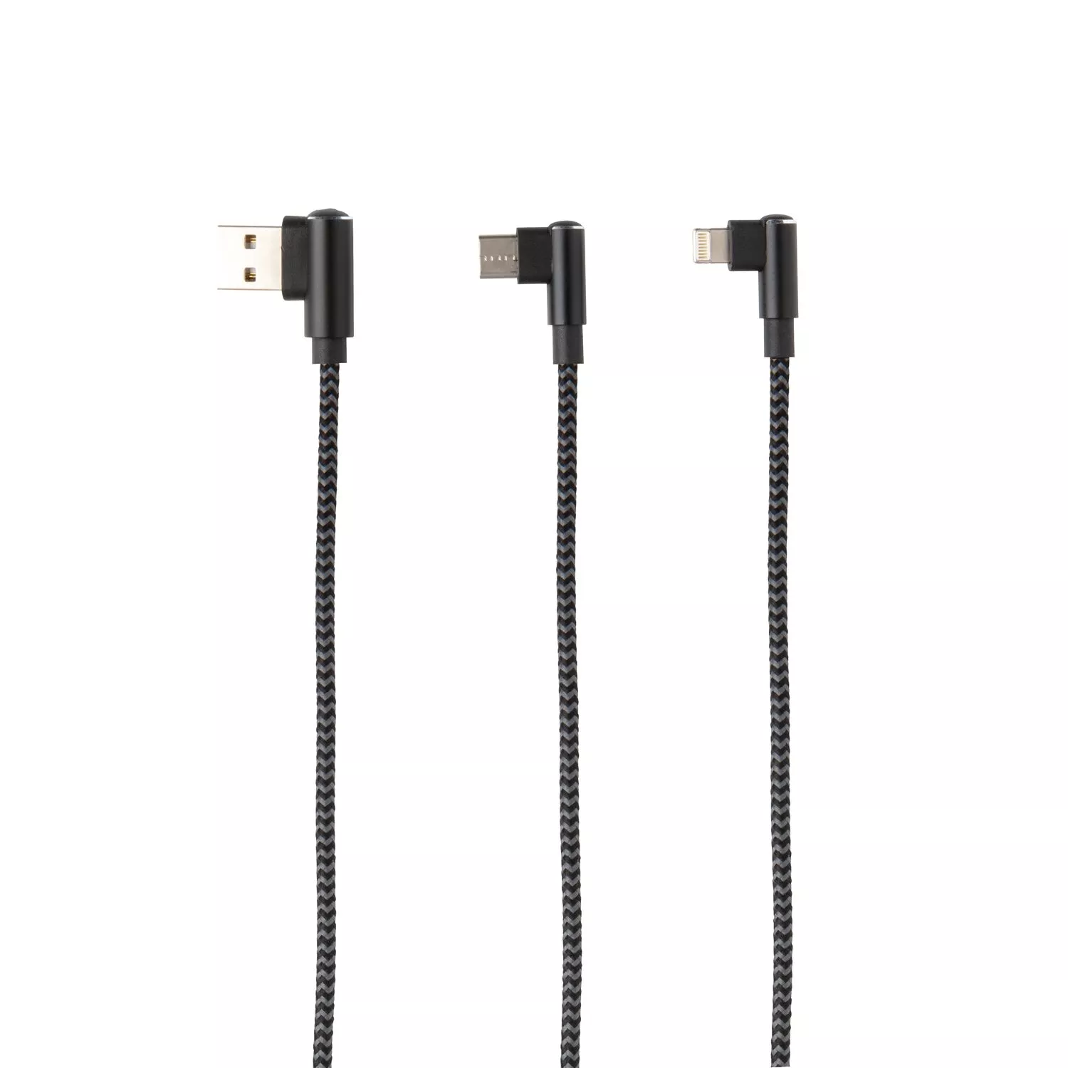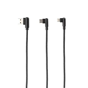 Кабель Luxury 3 в 1 с оплёткой из нейлонового материала, разъёмы изготовлены из прочного алюминия. У этого аксессуара предусмотрены три выхода: Type C и комбинированный разъем для устройств на платформе iOS и на платформе Android (micro USB). Угловое расположение разъемов идеально подойдет для зарядки устройств. Длина – 80 см. В комплект входит стильный PU ремешок. Кабель упакован в подарочную коробку.