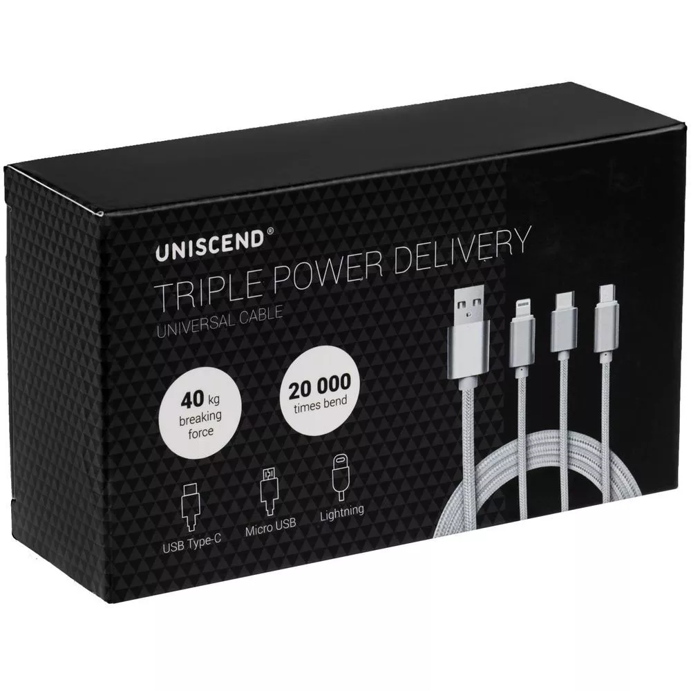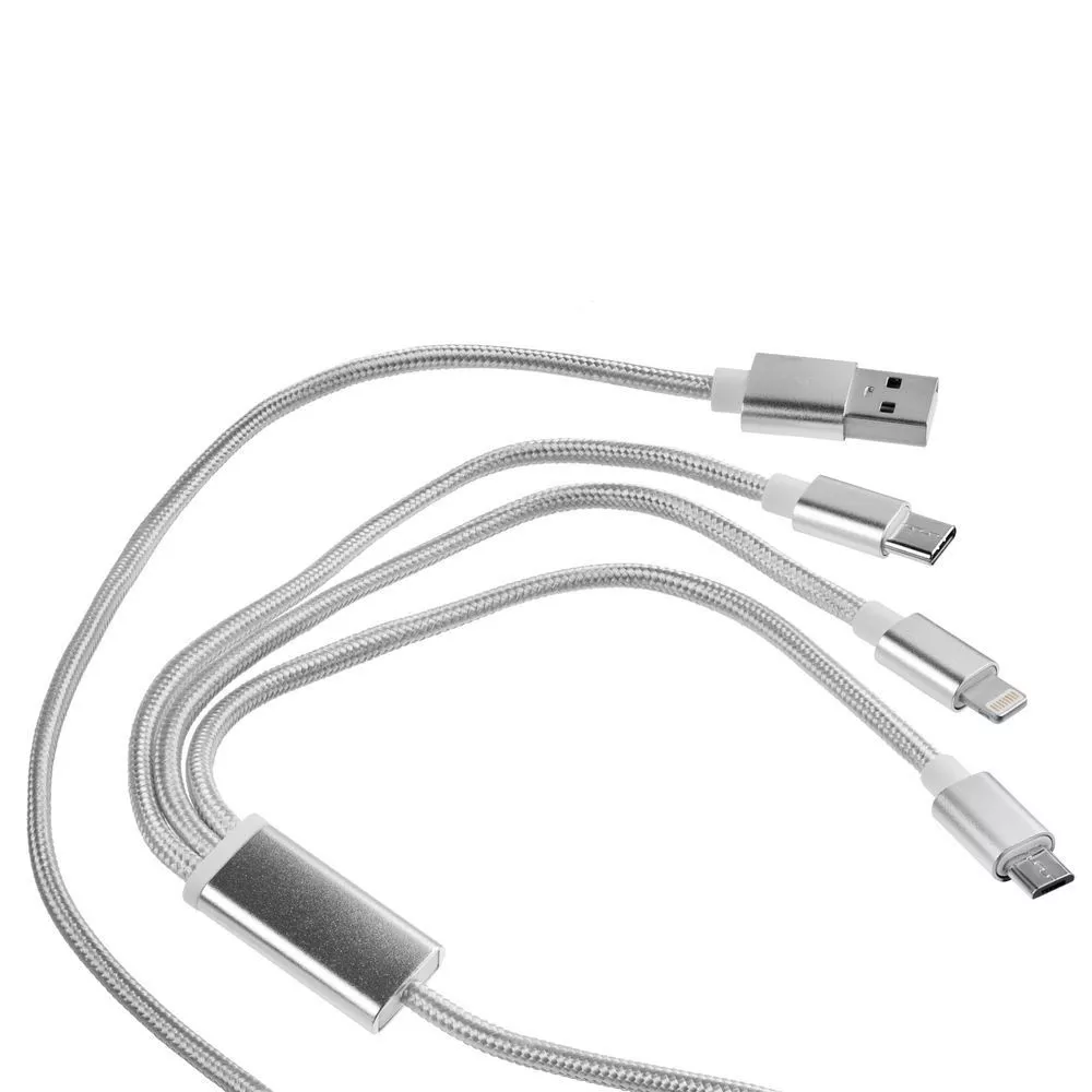 Прочный кабель в текстильной оплетке с 3 разъемами — универсальное решение для передачи данных и быстрой зарядки смартфонов и гаджетов.
