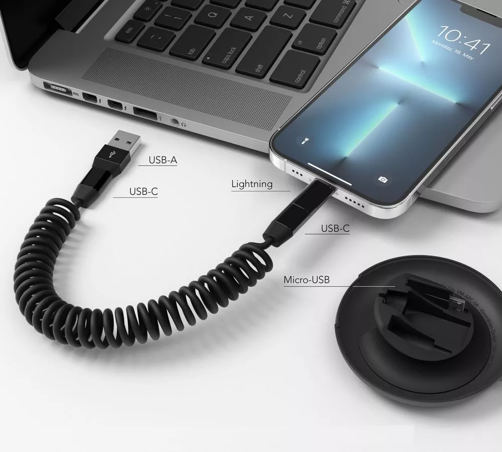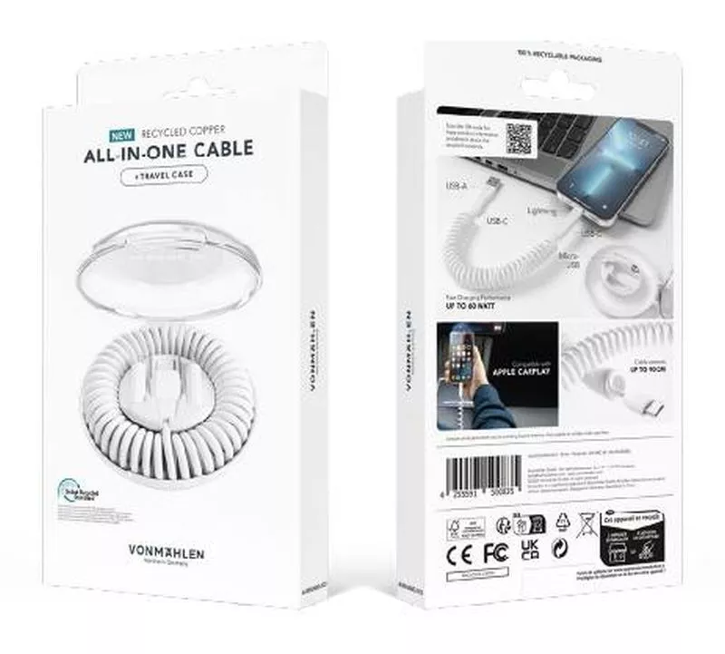 Allroundo Еco — экологичный компактный универсальный кабель для быстрой зарядки и передачи данных (в конфигурации с USB-C на USB-C), который более чем на 75% состоит из переработанных материалов. Витой кабель, длина которого достигает 90 см, обеспечивает еще большую свободу передвижения во время процесса зарядки. В комплект входят адаптеры с разъемами USB-A, microUSB и Lightning, поэтому кабель подходит для всех современных устройств.