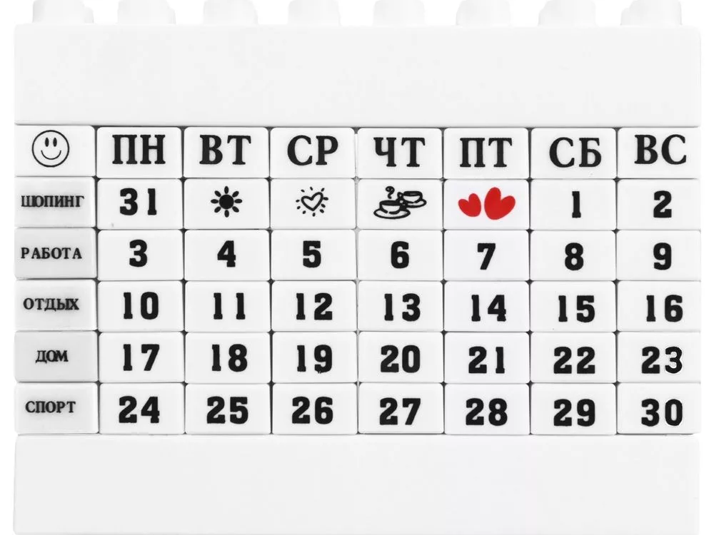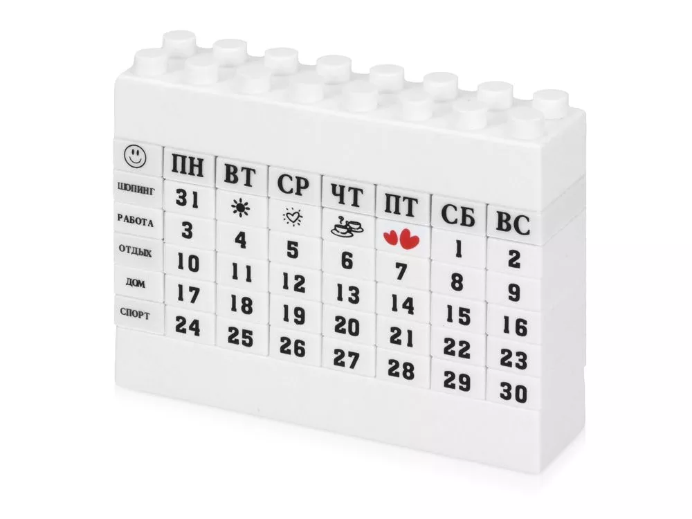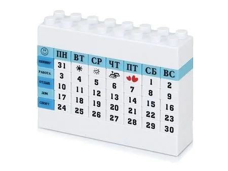 Замечательная и креативная идея для активных и целеустремленных людей. Календарь в виде конструктора Lego подчеркнет индивидуальность обладателя и поможет держать ритм жизни под контролем. Календарь поможет в планировании рабочего и свободного времени, ведь кубики можно собирать так, как вы того хотите, учитывая ваши планы и приоритеты.