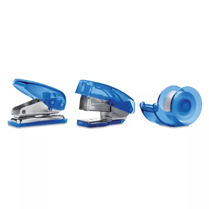 Настольный мини набор включающий в себя степлер с 500 скобами, дырокол и скотч. Поставляется в компактной пластиковой коробке.