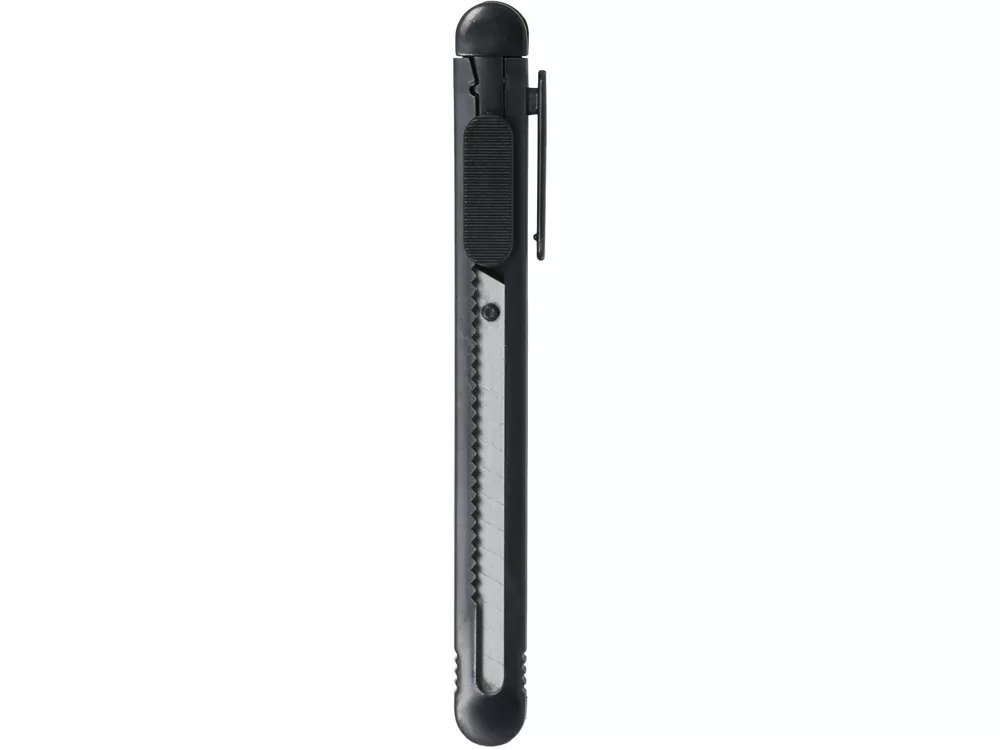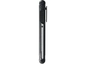 Универсальный нож с выдвижным сменным лезвием 80x9 мм, с 12 сегментами. Встроенный инструмент для замены лезвия и зажим для крепления к карману. ПС-пластик.