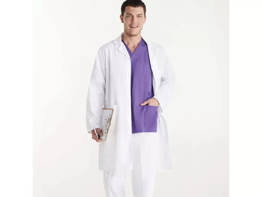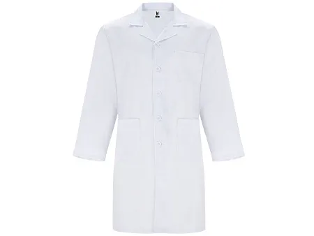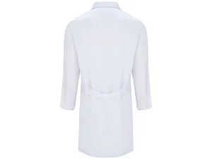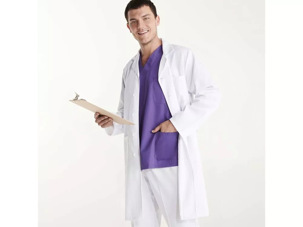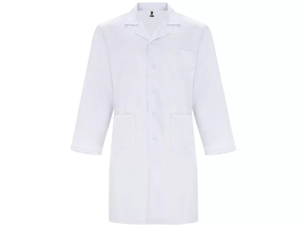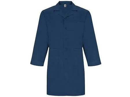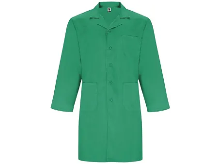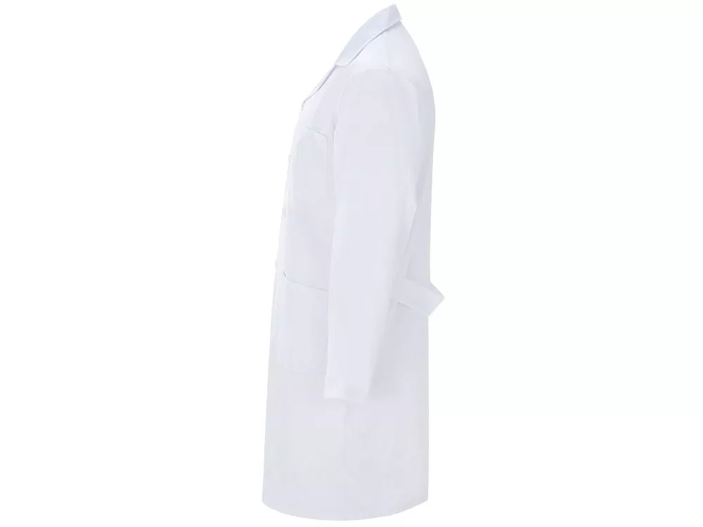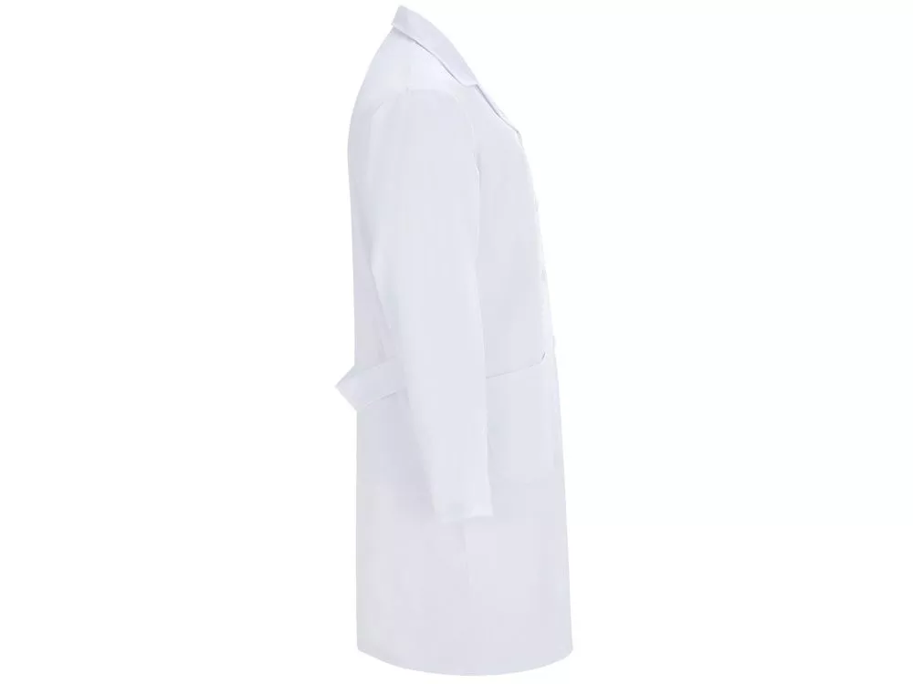 Халат для персонала с длинными рукавами. · Воротник с лацканами. · Центральная застежка на 5 пуговиц в тон. · Один нагрудный карман и два кармана по бокам. · Пояс сзади.