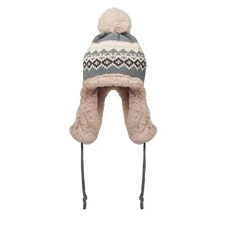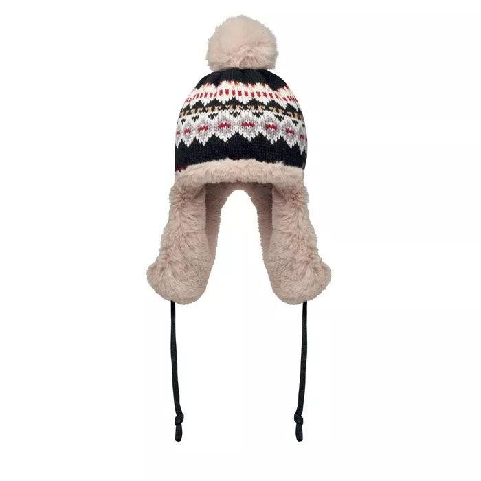 Knitted beanie with ear flaps and pompom in acrylic fibre with polyester and fleece lined. Includes label for printing area on one side. Adult size.