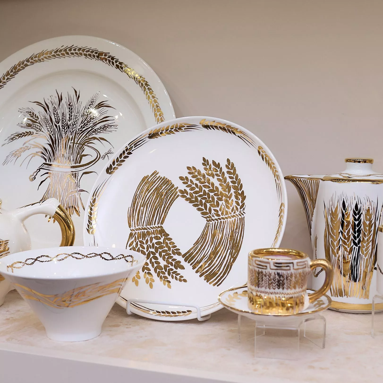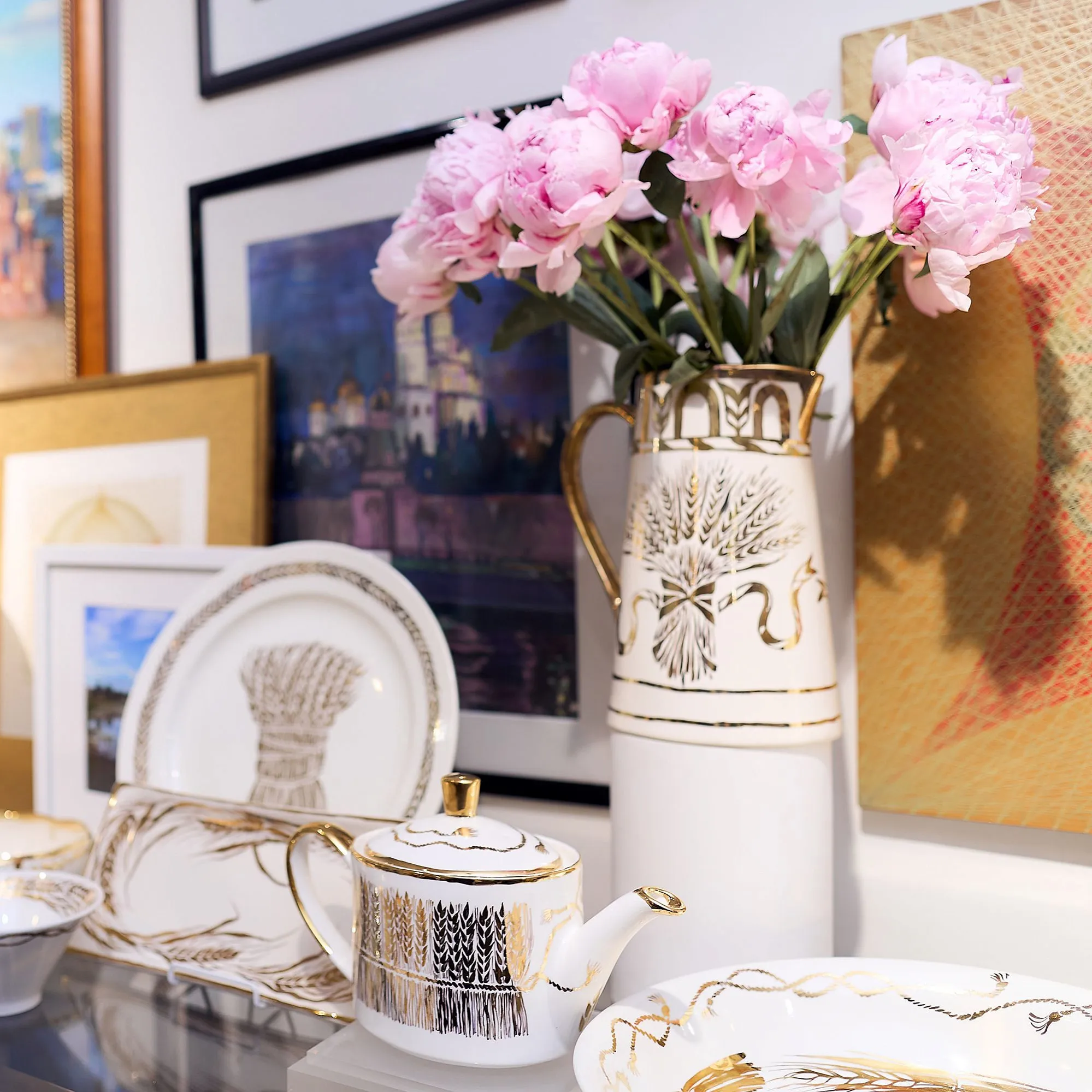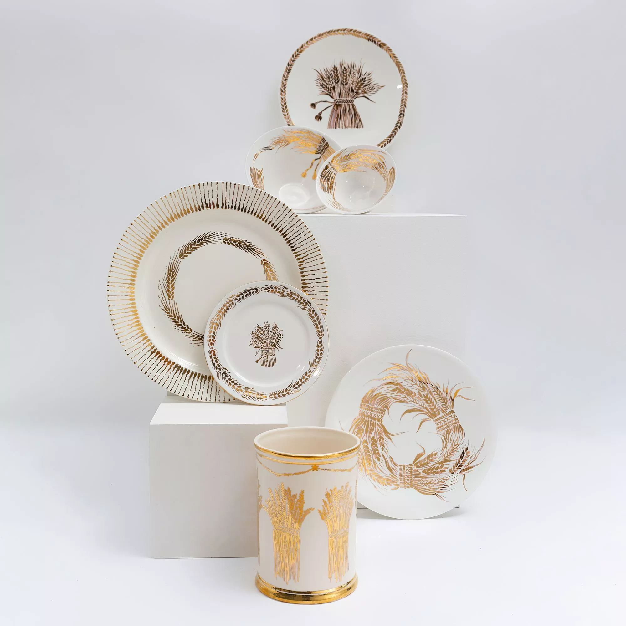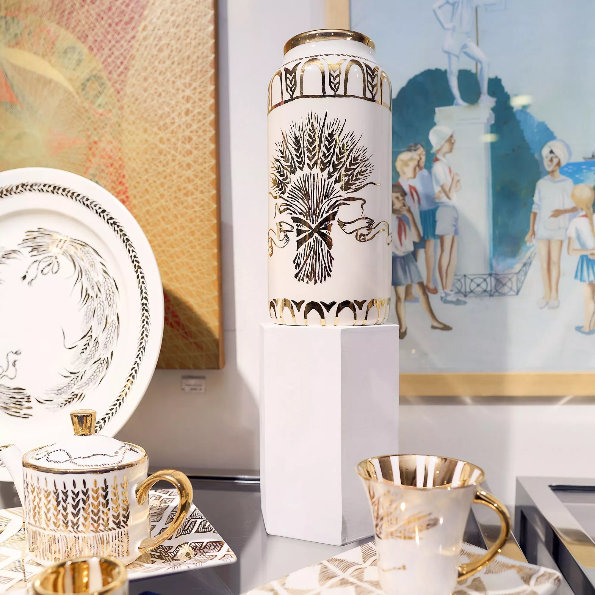 Gourji Ceramics – новая линия бренда, которая на сегодняшний момент насчитывает 5 коллекции.Коллекция «Пшеница» – флагманская коллекция Gourji Ceramics, вдохновлённая советским классицизмом и убранством Московского метрополитена.Каждый предмет коллекции уникален и изготовлен вручную, за счёт чего предметы имеют оригинальную форму и могут незначительно отличаться по исполнению рисунков на них.В коллекцию входят чайные и кофейные наборы, кувшины и вазы, блюда и салатницы и другие декоративные предметы, что позволяет собрать сервиз по любой вкус.
