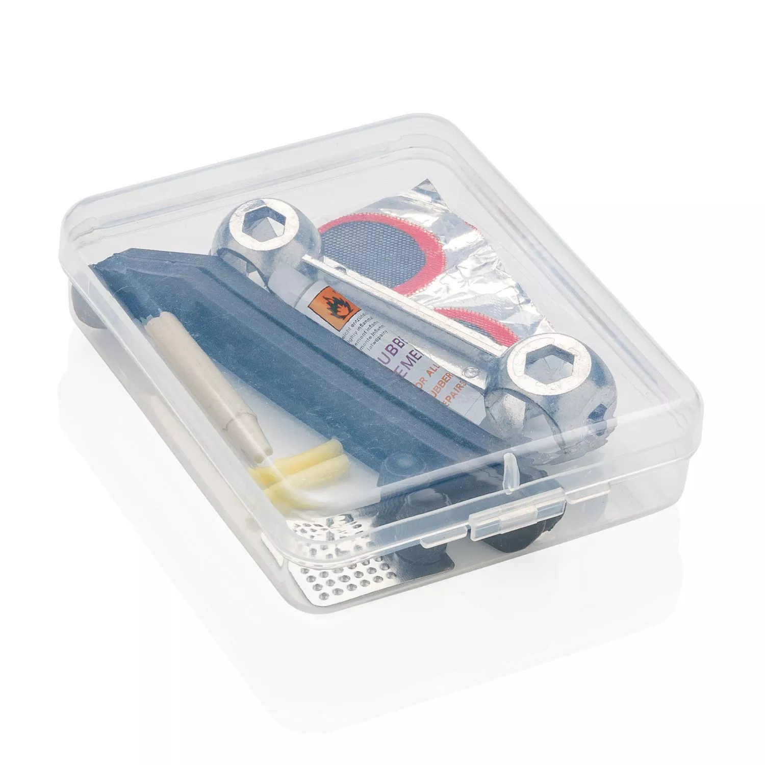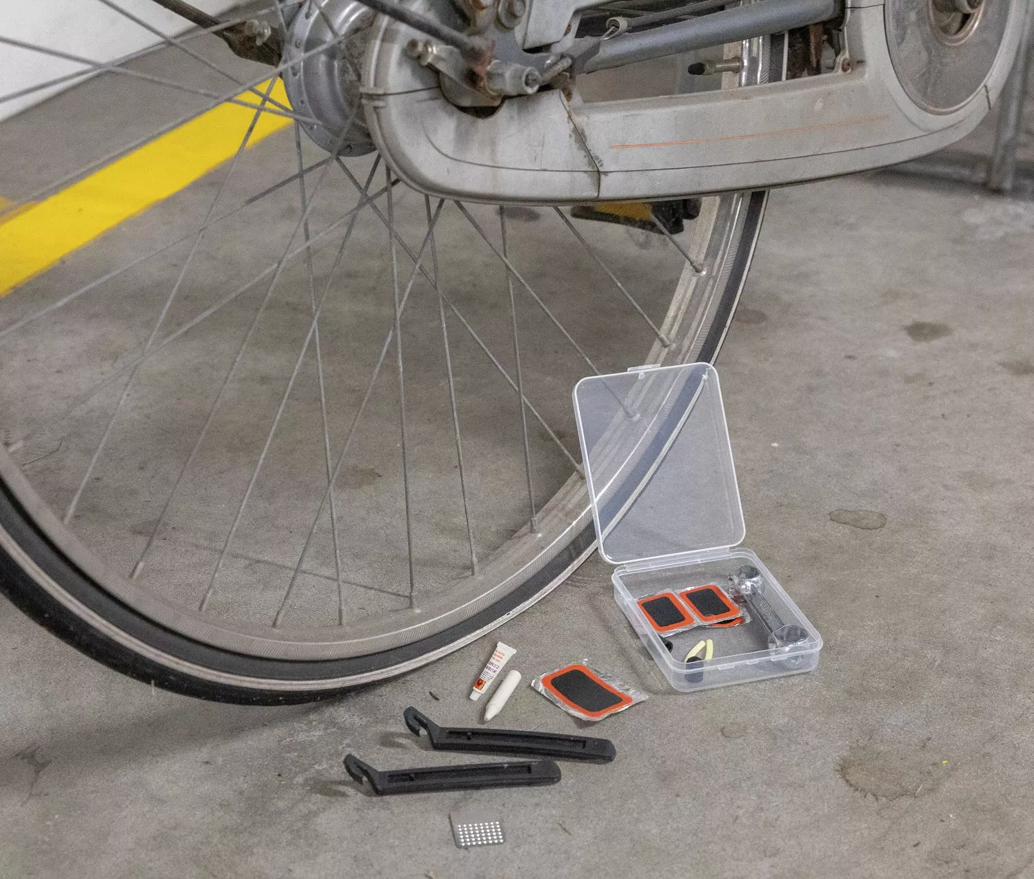 Набор для ремонта велосипеда поставляется в кейсе из полипропилена, который так просто взять с собой. В комплекте: 1 ключ из алюминиевого сплава, 2 монтажки для шин, 1 тюбик клея, 2 колпачка клапанов, 2 трубки клапанов, 1 терка, 5 ремонтных пластырей.