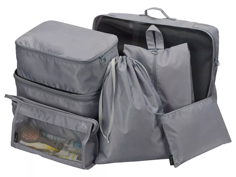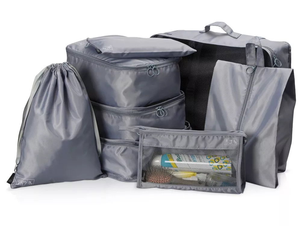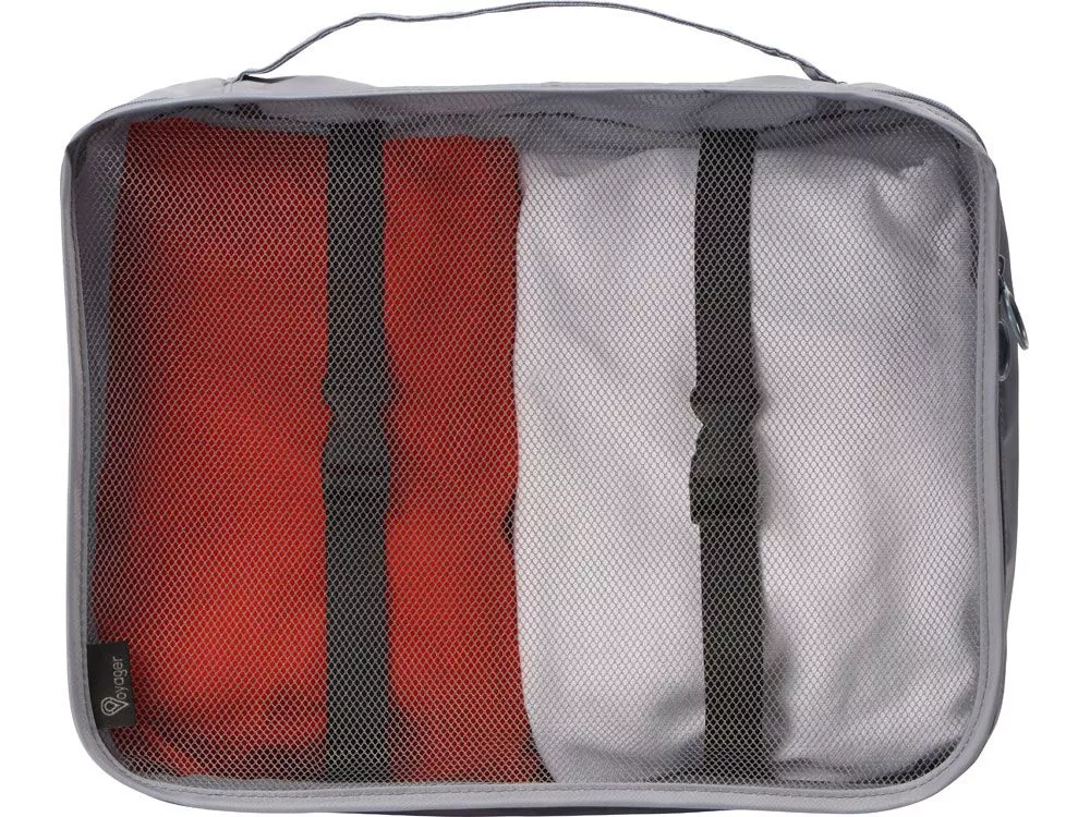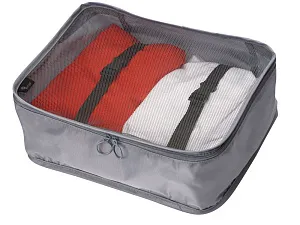 Набор чехлов для одежды от бренда Voyager, выполненный из прочного качественного полиэстера 290D, организует ваши вещи в чемодане во время путешествия и поможет разместить их комфортно в шкафу. В отличие от пакетов чехлы многоразовые, что наверняка понравится защитникам природы, их легко стирать, сушить и хранить. Набор состоит из восьми чехлов, упакованных в один большой с сетчатой стенкой. Этот чехол оборудован ручкой для переноски и кнопками на задней стенке, которые позволяют компактно сложить изделие вдвое в зафиксированном положении для хранения. Чехлы — самых разных форм и размеров, предназначенные для разнообразного содержимого: одежды, обуви, косметики и гигиенических принадлежностей. Чехлы выполнены в виде мешков на кулиске, сумок на молнии, косметичек, некоторые из них оснащены сеткой для циркуляции воздуха и доступного просмотра содержимого, а также ручками для переноски и подвешивания. Иконки на чехлах подскажут, для чего предназначен каждый из них. Удобные язычки молнии выполнены в виде большого кольца, который легко нащупать вслепую, для удобства молния оснащена двумя бегунками. В комплекте: - чехол для гигиенических средств 26,5 х 16 х 7 см, - чехол для носков и белья 26 х 16,5 см, - чехол для футболок и носков 26,5 х 35 см, - чехол для обуви 33 х 22 см, - чехол для футболок и белья 30 х 21 х 12 см, - чехол с сеткой малый 29 х 20 х 12 см, - чехол с сеткой средний 30 х 24 х 12 см, - чехол с сеткой большой 40 х 30 х 12 см Трафаретная печать (1 цвет (цветные изделия)) на данный товар осуществляется бесплатно. Оплачивается только настройка оборудования в размере 10000 рублей на весь тираж.