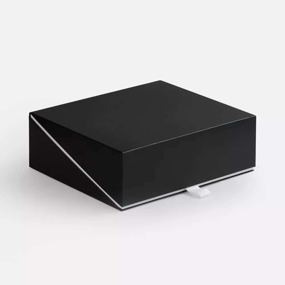 Коробка изготовлена из переплетного картона. Внутренний короб каширован мелованной бумагой с ламинацией, внешний корпус — лайнером из металлизированной бумаги Magestic цвета «Антрацит», плотностью 120 г/м². Крышка фиксируется на магнит.
