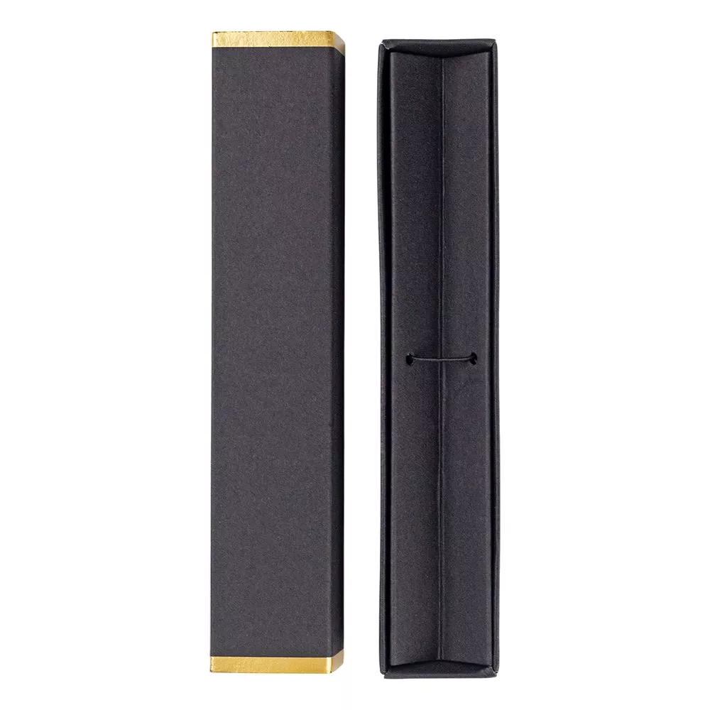 Бумажная коробочка для ручки. Ложемент V-образный с резинкой, фиксирующей ручку. По краям крышки металлизированные декоративные элементы, для красоты. В такой коробочке подаренная ручки будет выглядеть ещё дороже, словно фотомодель в вечернем платье.