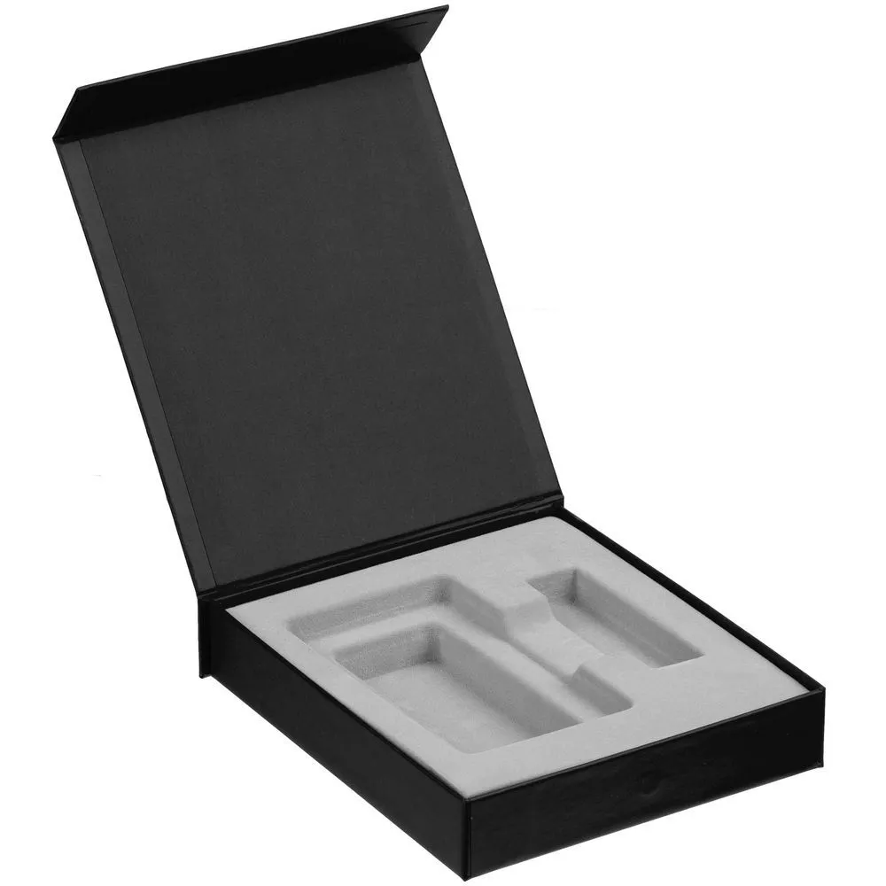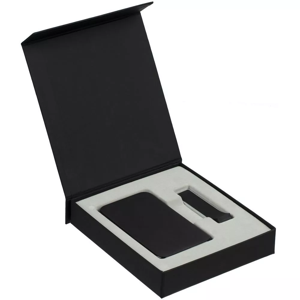 Подарочная коробка для аккумулятора 12,3х7,1х1 см и флешки 8,2х2,2х1,2 см с крышкой на магните и флокированным ложементом.