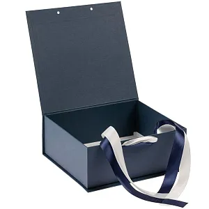 Коробка выполнена из переплетного картона, кашированного дизайнерской бумагой Majestic, с крышкой на лентах.