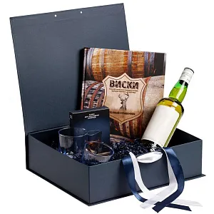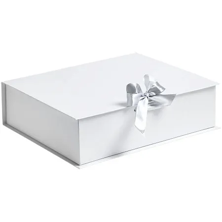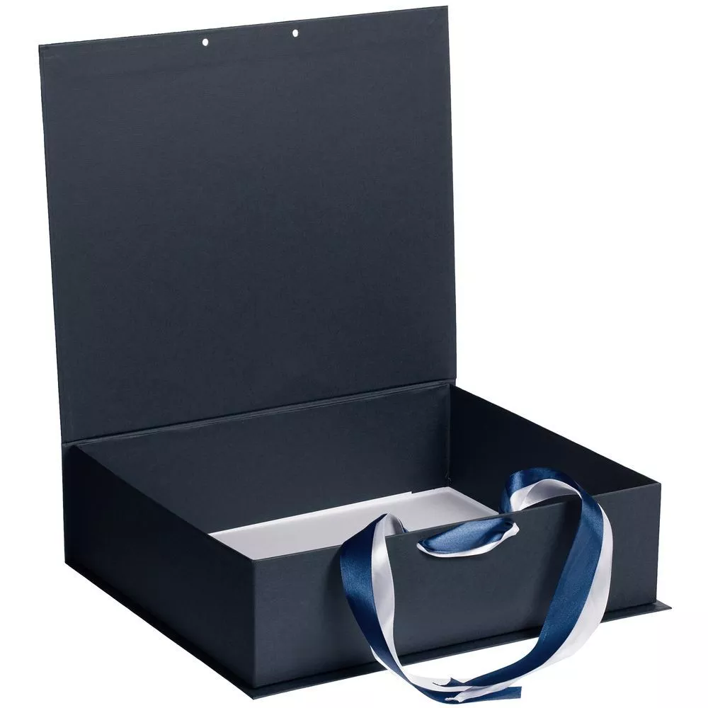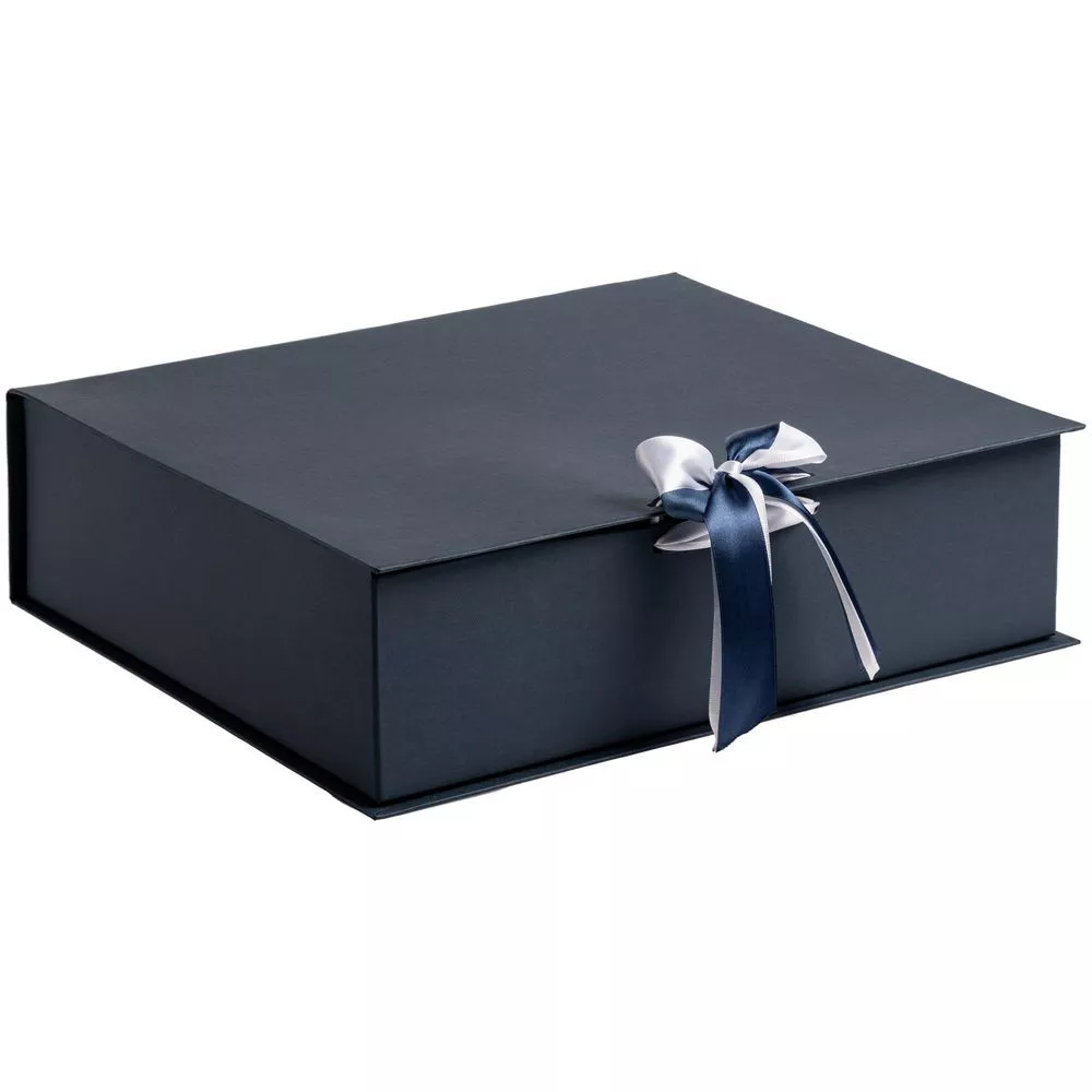 Коробка выполнена из переплетного картона, кашированного дизайнерской бумагой Majestic, с крышкой на лентах.