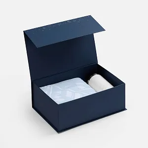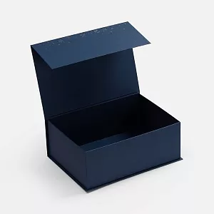 Коробка выполнена из переплетного картона толщиной 1,5 мм, кашированного бумагой с тиснением серебристой фольгой.