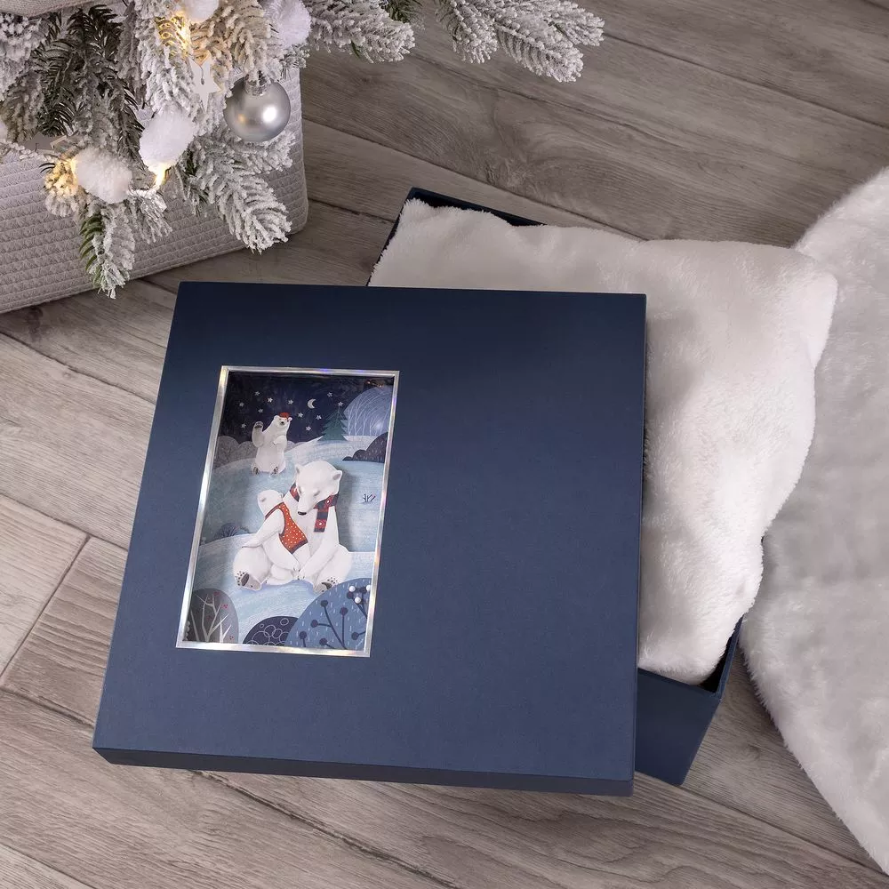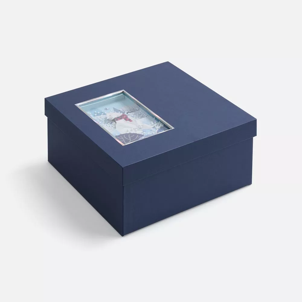 Элегантная коробка из переплетного картона The Blue Bear станет настоящим украшением зимних праздников. Ее главная изюминка — очаровательное окошко с 3D-иллюстрацией, которое словно приглашает в мир новогодних чудес.