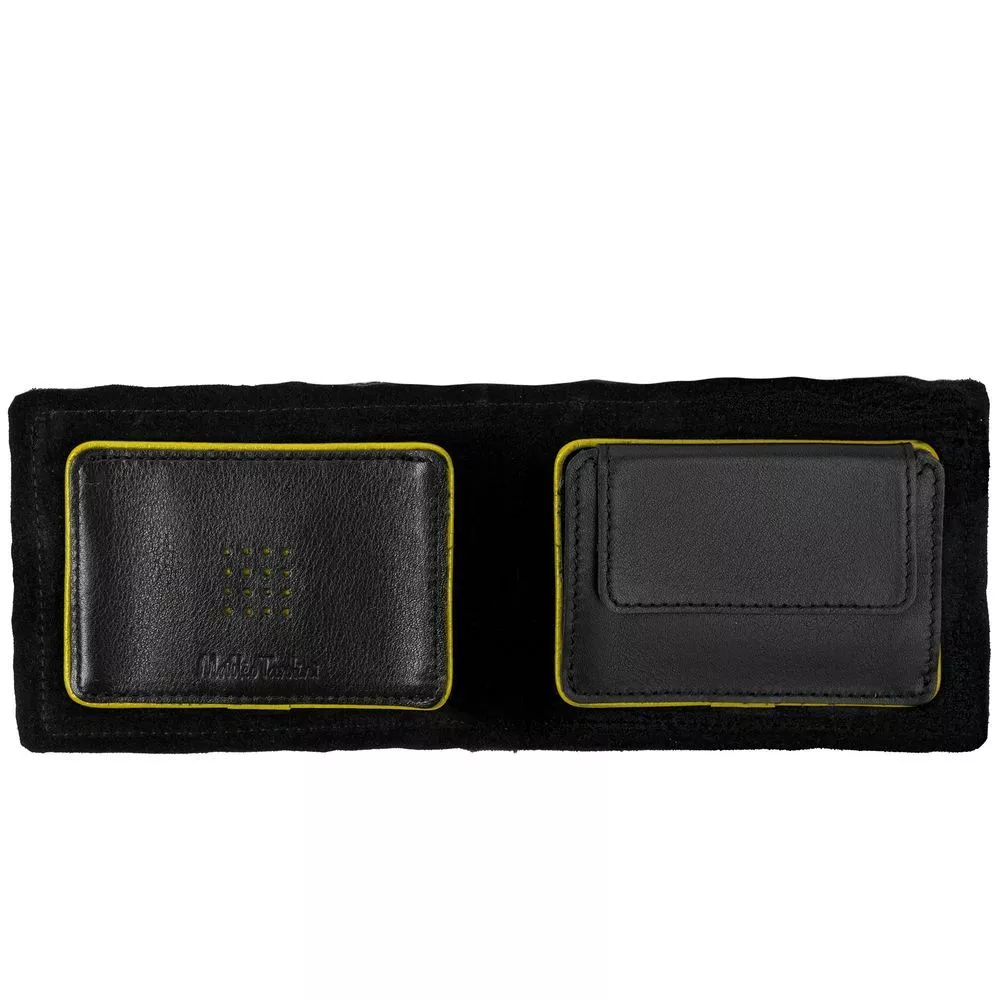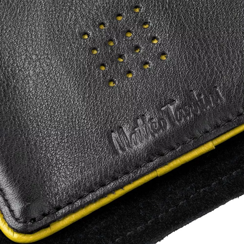 Натуральная кожа глубокого черного цвета и яркая контрастная окантовка — как страстная южная натура, сдержанная рамками условных приличий.