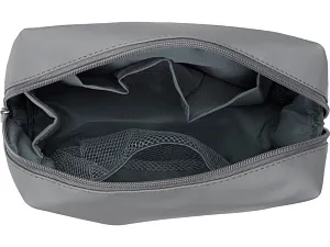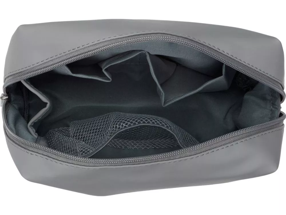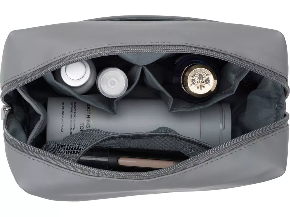 Вместительная и приятная на ощупь косметичка из экокожи с покрытием софт-тач - незаменимый спутник в любых поездках. В ней легко поместится вся необходимая уходовая или декоративная косметика и даже кисти. 2 отделения внутри и 1 снаружи помогут удобно разложить все любимые баночки и флакончики. Стильный серый цвет делает косметичку универсальным полем для логотипов любого цвета. - приятная поверхность софт-тач; - внутри дополнительные кармашки для мелочей; - удобный внешний карман.
