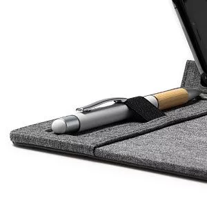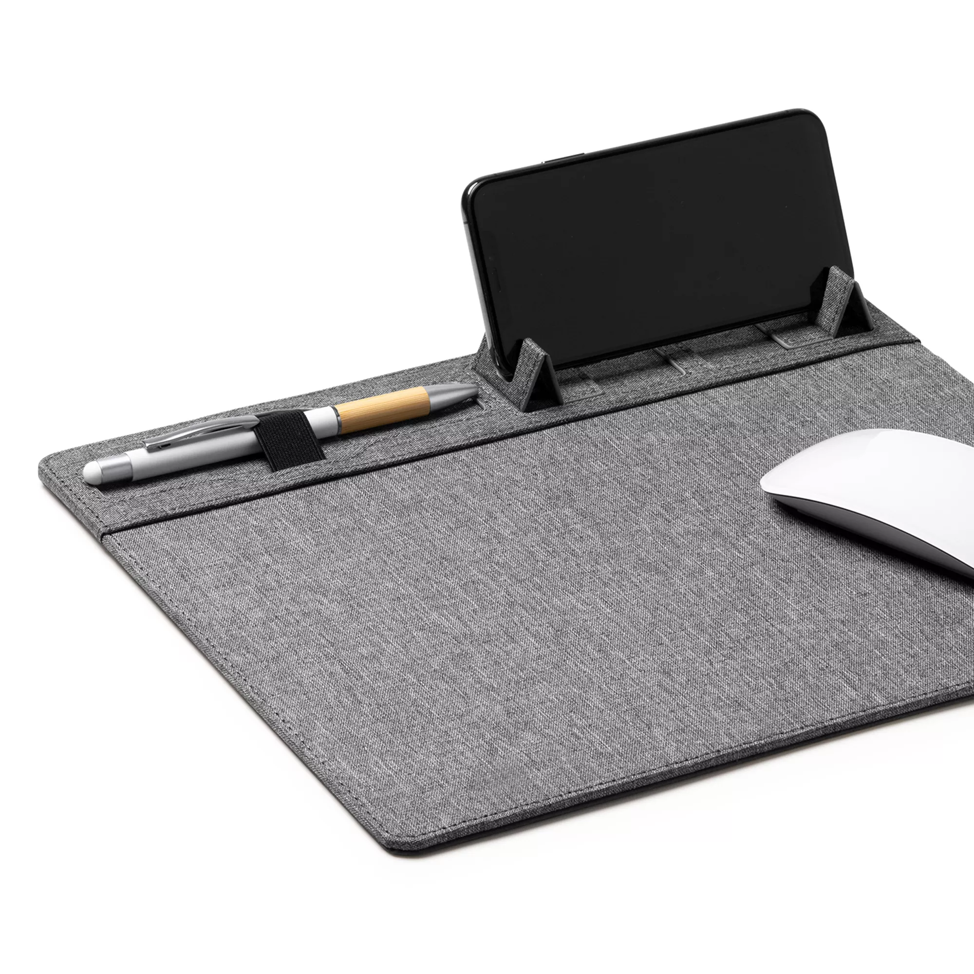 Коврик для мыши из RPET со встроенным беспроводным зарядным устройством мощностью 10 Вт. В комплект входят подставка для мобильного телефона и для ручки.