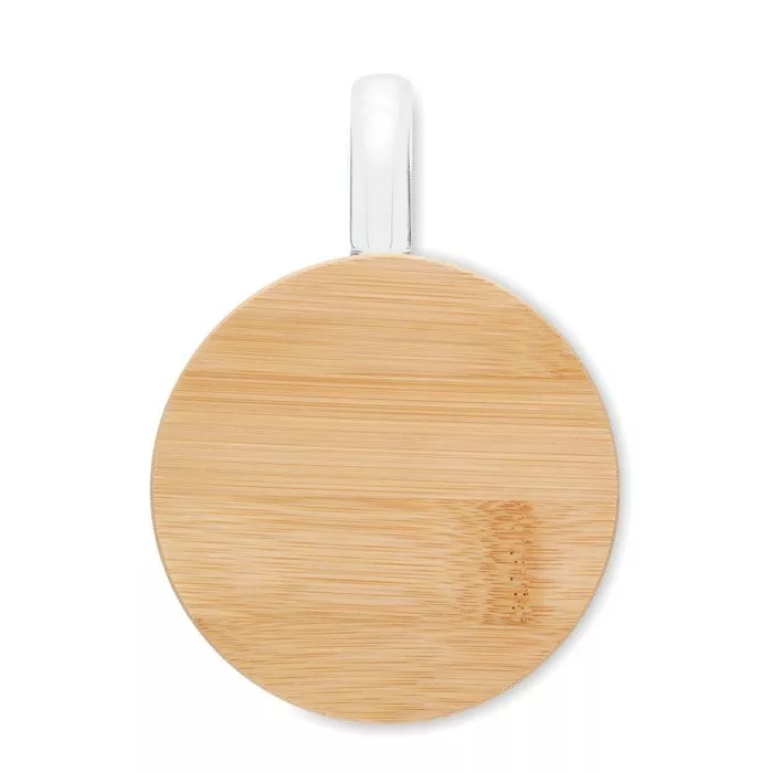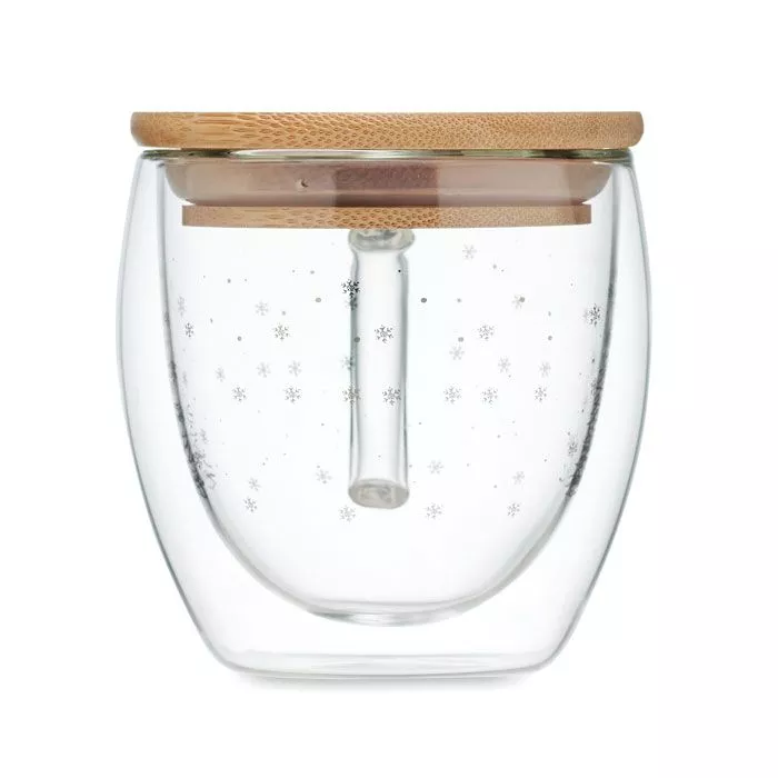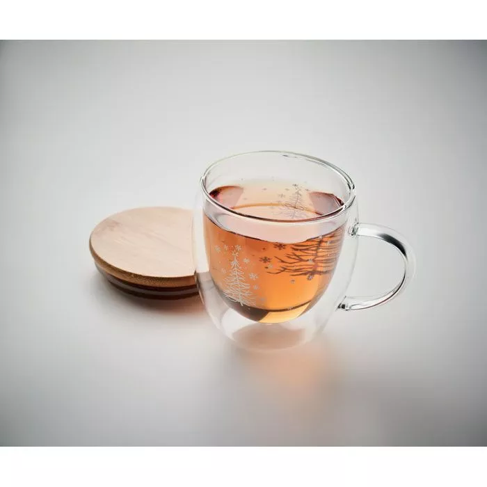 Кружка с двойными стенками из боросиликатного стекла с бамбуковой крышкой (рисунок дерево). Объем: 220 мл.