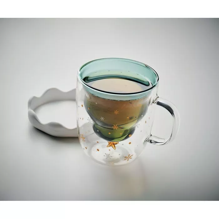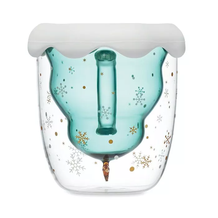 Кружка с двойными стенками из боросиликатного стекла с сезонным дизайном, силиконовой крышкой и подставкой. Объем: 250 мл.