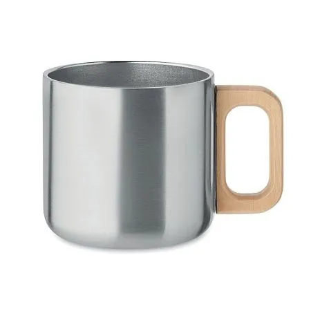 Кружка с двойными стенками из переработанной нержавеющей стали (90%) и обычной нержавеющей стали (10%) с деревянной ручкой. Объем: 350 мл.