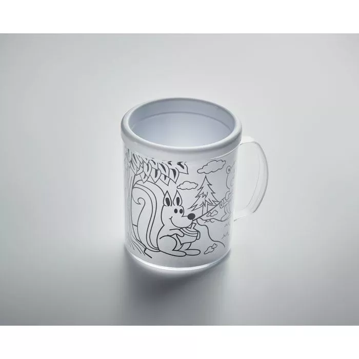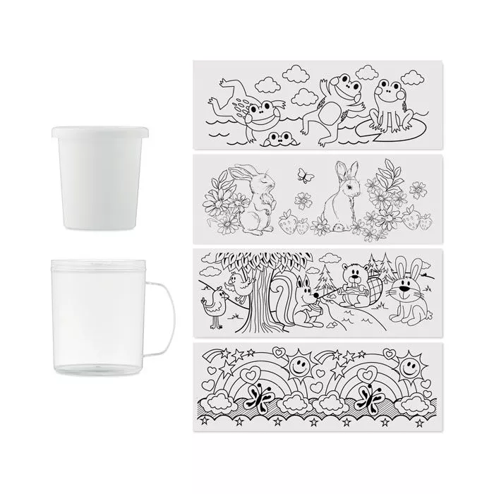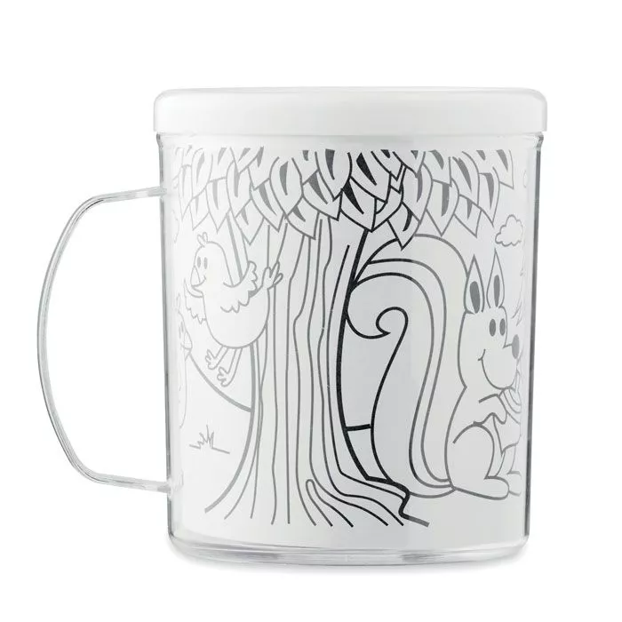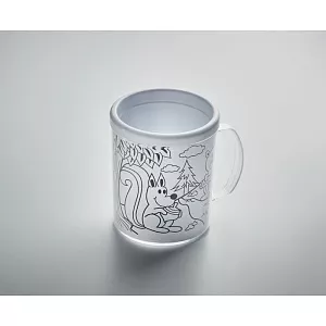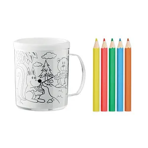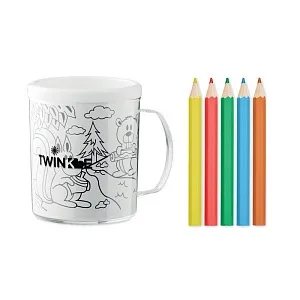 Кружка с двойными стенками из полистирола в комплекте с разноцветными карандашами, включает 4 картинки для раскрашивания. Объем 280 мл