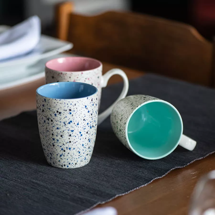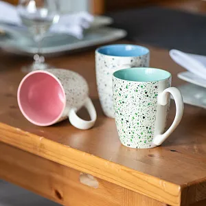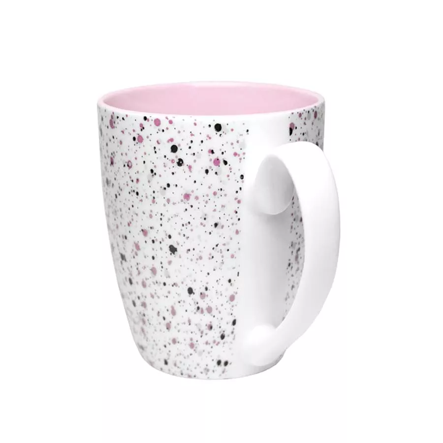 Кружка наиболее популярной формы с нежным цветом внутри и новым необычным покрытием снаружи. TERRAZZO - старинный венецианский узор с мелкими цветными вкраплениями. Изначально использовался для декорирования пола и изделий из камня. В современном интерьере этот материал стали использовать в самых неожиданных вариациях, при изготовлении посуды, мебели, кухонных фасадов, для оформления интерьера ванных комнат, в качестве светильников и других аксессуаров для дома. А проекты с использованием терраццо в интерьере заполонили Instagram и Pinterest дизайнеров и поклонников дизайна по всему миру. Цвет внутренней части близкий к Pantone 495C