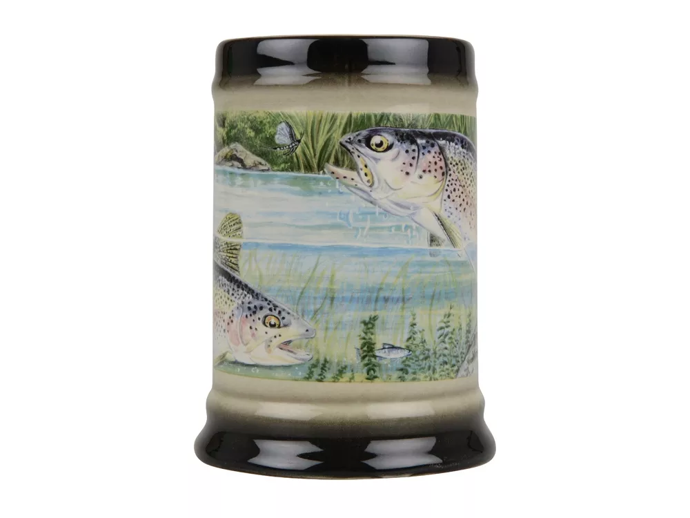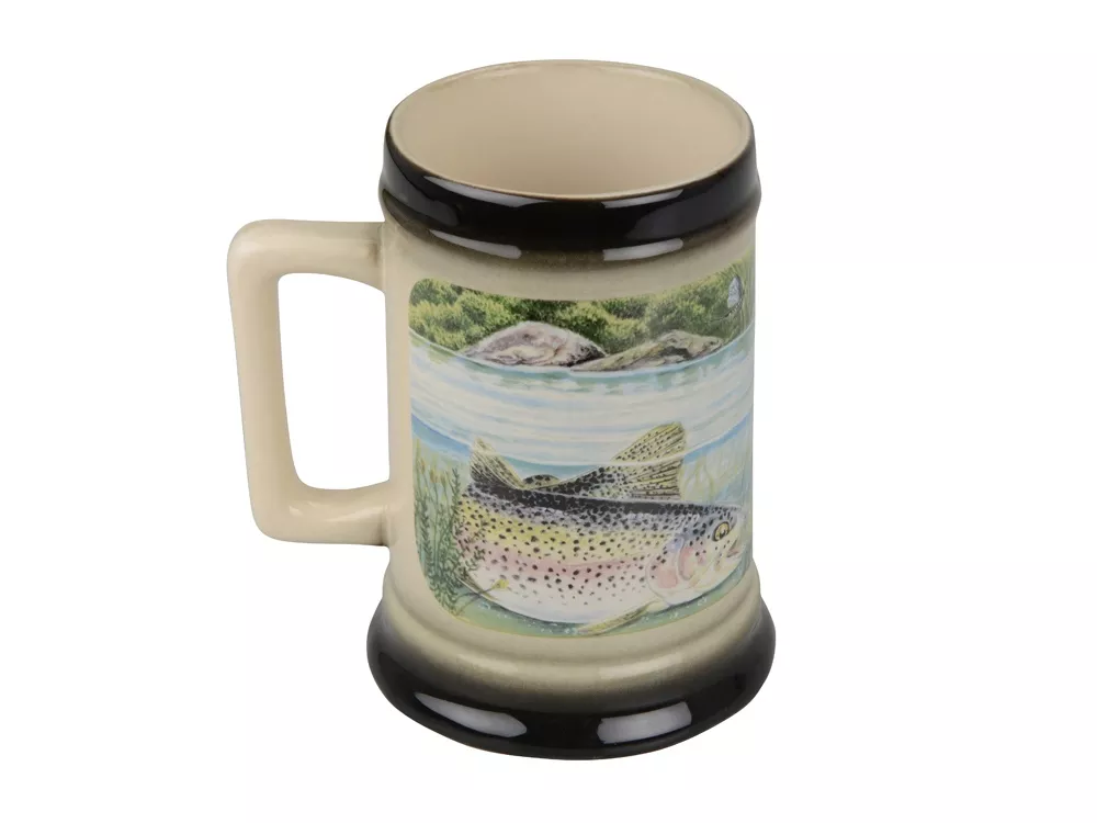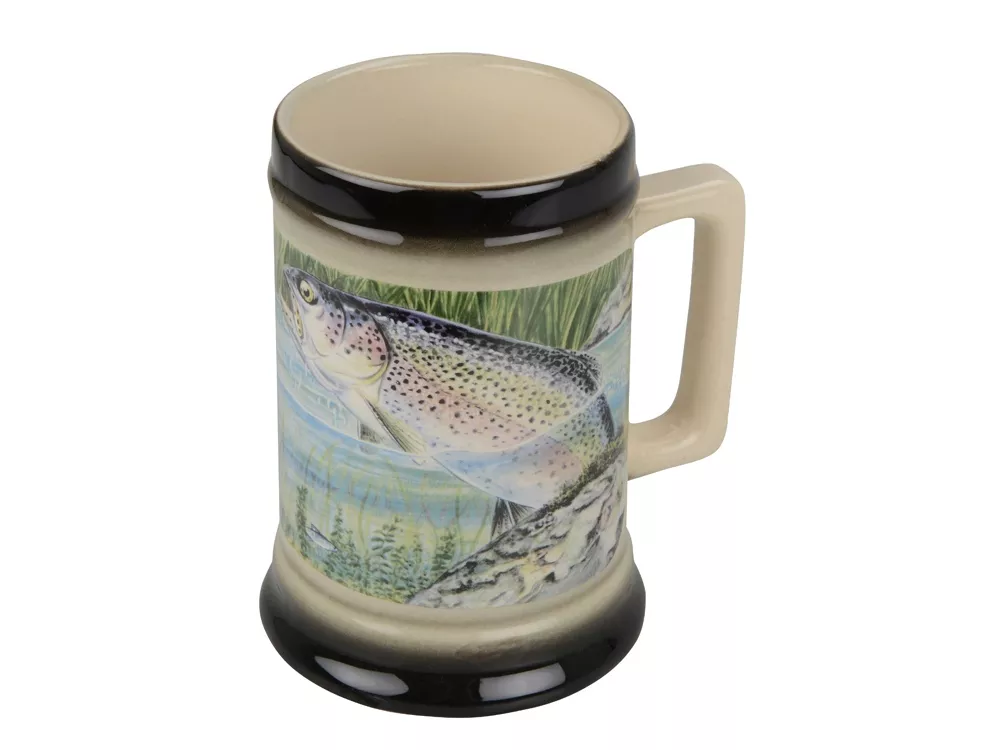 Удобная керамическая кружка украшена изображением рыбы в пруду. Кружка прекрасно подойдет в качестве подарка заядлым рыбакам. Красочное оформление по достоинству оценят любители необычных вещей.