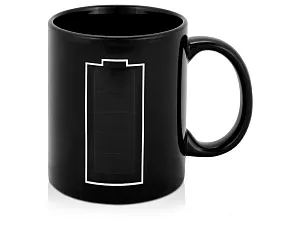 Креативная керамическая кружка на 320 мл черного цвета имитирует индикатор заряда батареи. Просто налейте в нее горячий напиток и батарейка зарядится. Замечательный подарок для любителей необычных вещей. * Кружку не рекомендуется мыть в посудомоечной машине, а так же пользоваться абразивными средствами при мытье.