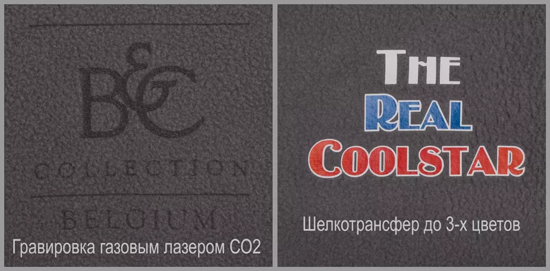 Возможно нанесение методом лазерной гравировки (газовый лазер СО2, код нанесения L1): детальная проработка мелких элементов и тонких линий с высоким контрастом изображения (рекомендуется на флисах темно-красного и стального серого цветов).