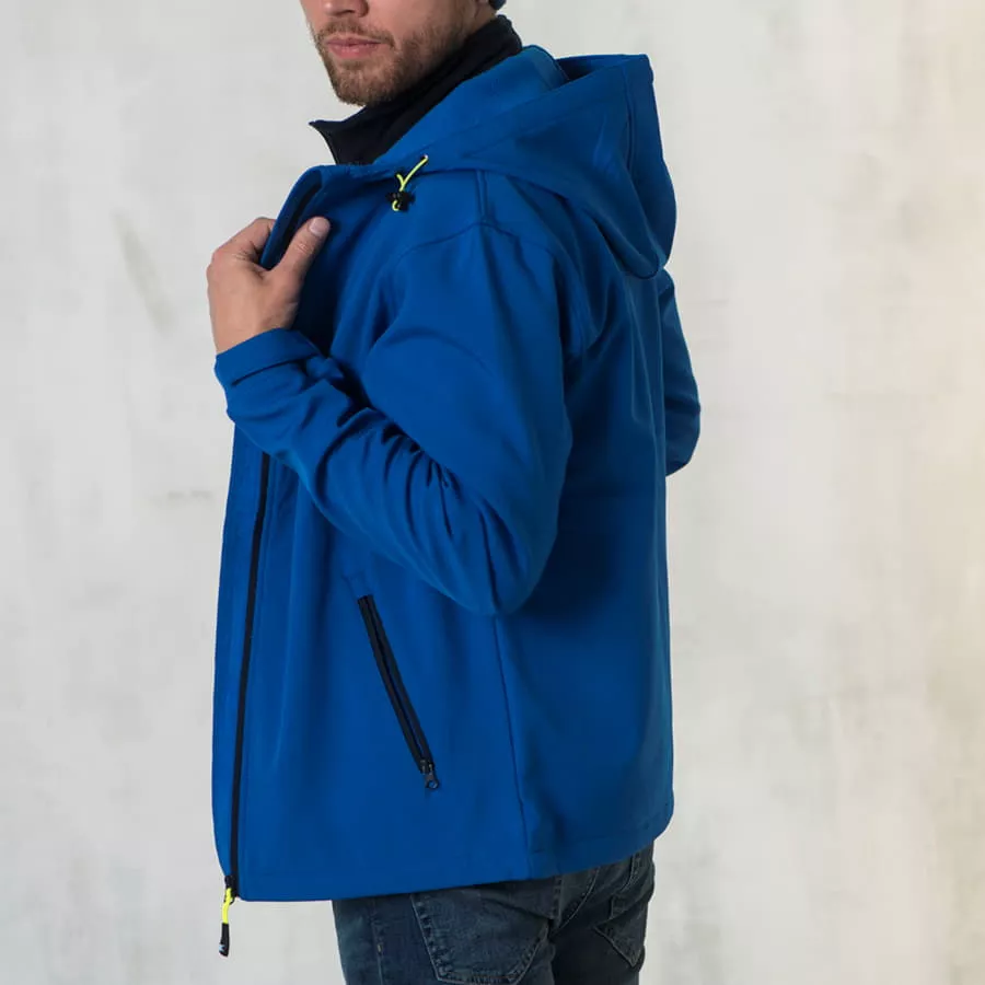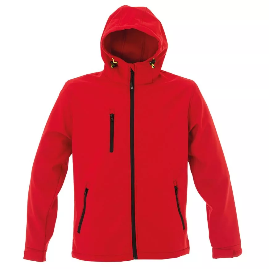 Основная ткань: цвет, близкий к Pantone 200 C, подкладка: цвет, близкий к Pantone 1807 C Ткань softshell. Водонепроницаемая и дышащая двухслойная куртка. Обратная облегченная пластиковая молния со съемным пуллером. Один нагрудный и два боковых кармана н