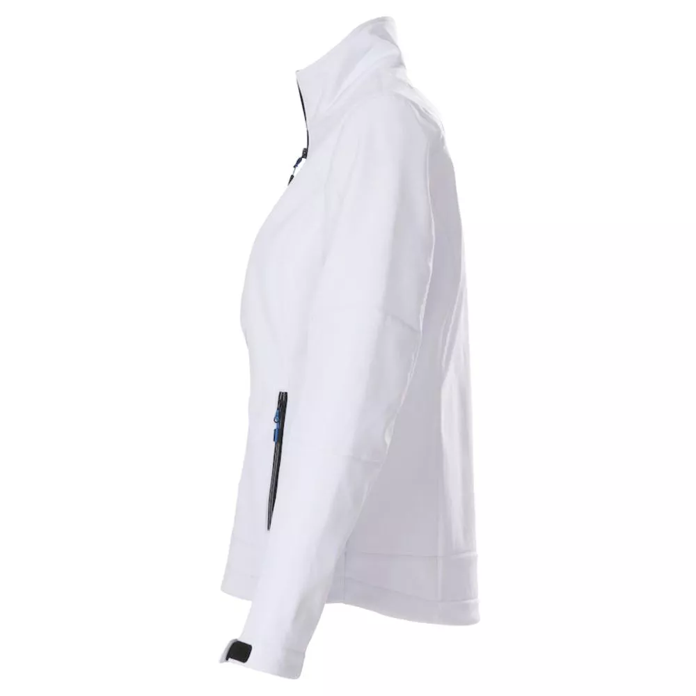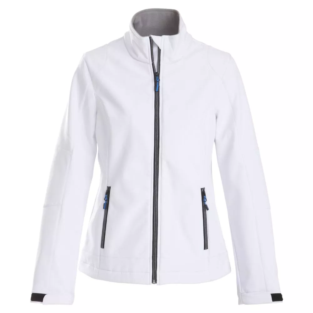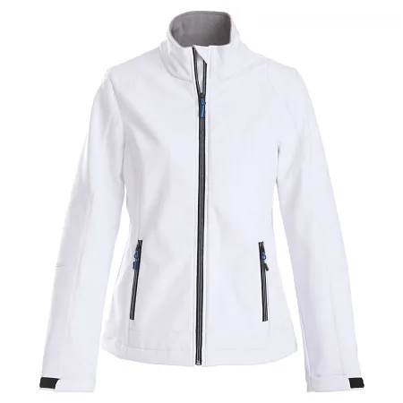 Женский софтшелл из эластичного материала c водоотталкивающим покрытием. Застегивается на молнию. Два передних кармана на молниях. Регулируемые рукава с «липучками», по низу куртки — уплотняющий шнурок. Есть возможность подобрать цвет пуллеров для максимального соответствия визуальному стилю фирмы.