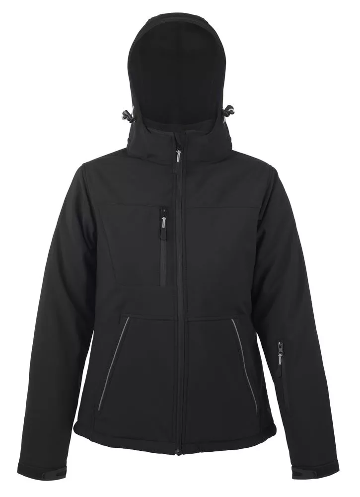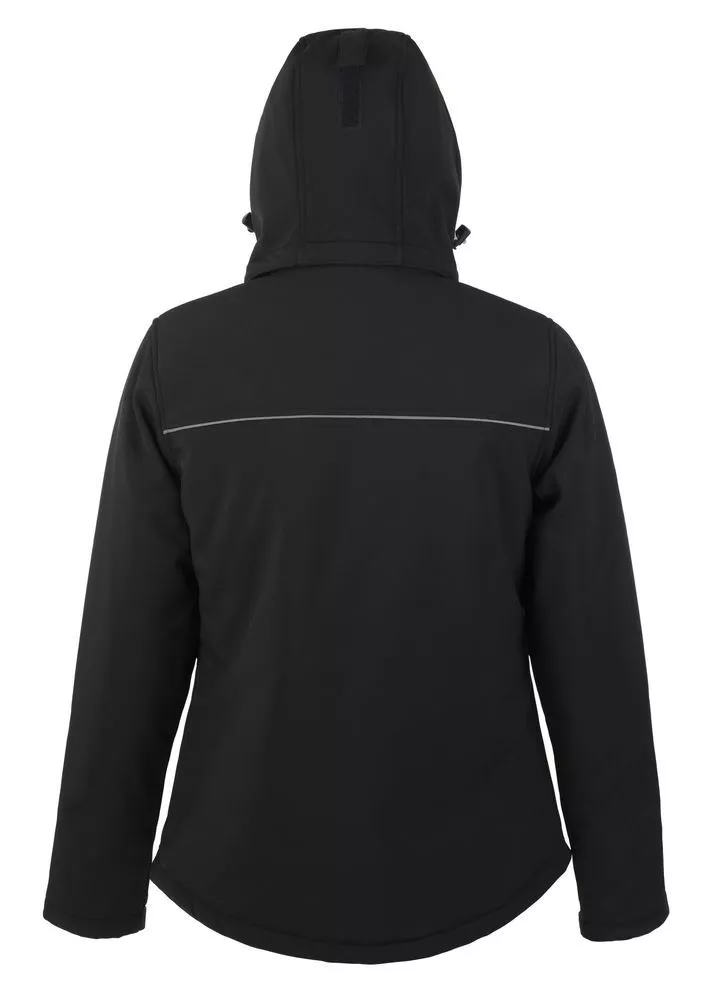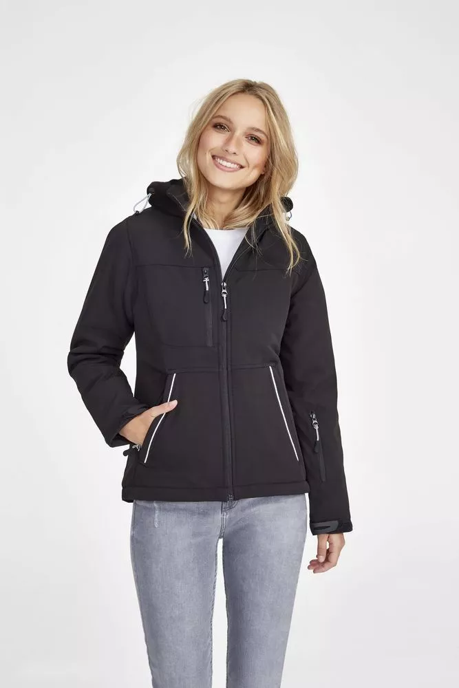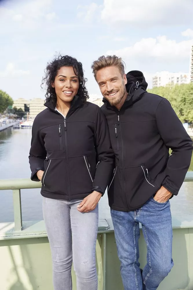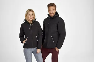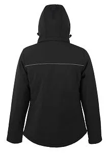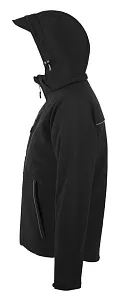 Полностью стеганый софтшелл. Снимающийся капюшон, регулируемый стягивающим шнуром, а также «липучкой» на спине. Закругленная задняя часть жакета. Две молнии для облегчения доступа к зонам нанесения. Стягивающие шнурки внизу изделия. Контрастные вставки серого цвета, светоотражающие детали.