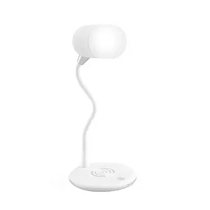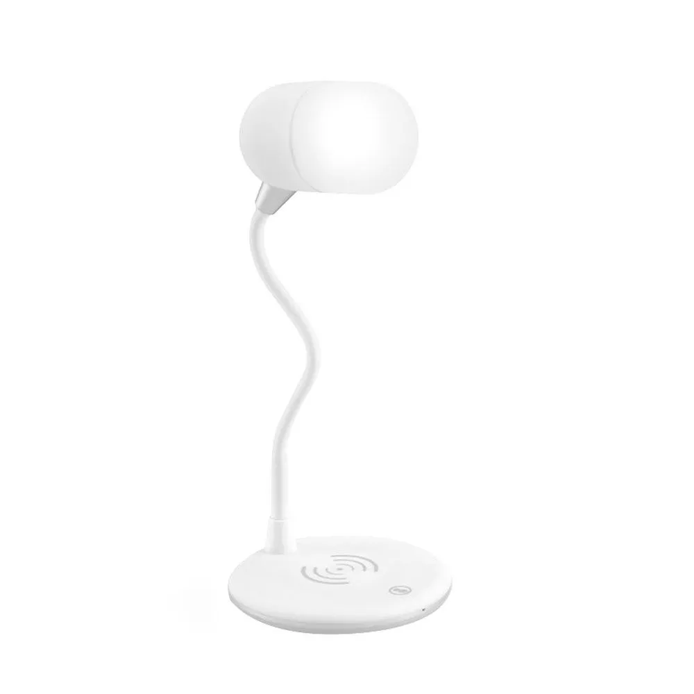 Настольная лампа с колонкой и беспроводной зарядкой Alladin. Тип светодиодного индикатора: cветодиодная панель (яркость 28LM±2), три режима настройки света (яркий, теплый, холодный), 7 светодиодов. Мощность: 5 Вт. Максимальная мощность беспроводного зарядного устройства: 5/10 Вт (опционально). Мощность динамика: 3 Вт. Вход:5V/3A. Версия Bluetooth: V5.0. В комплекте кабель USB и инструкция.