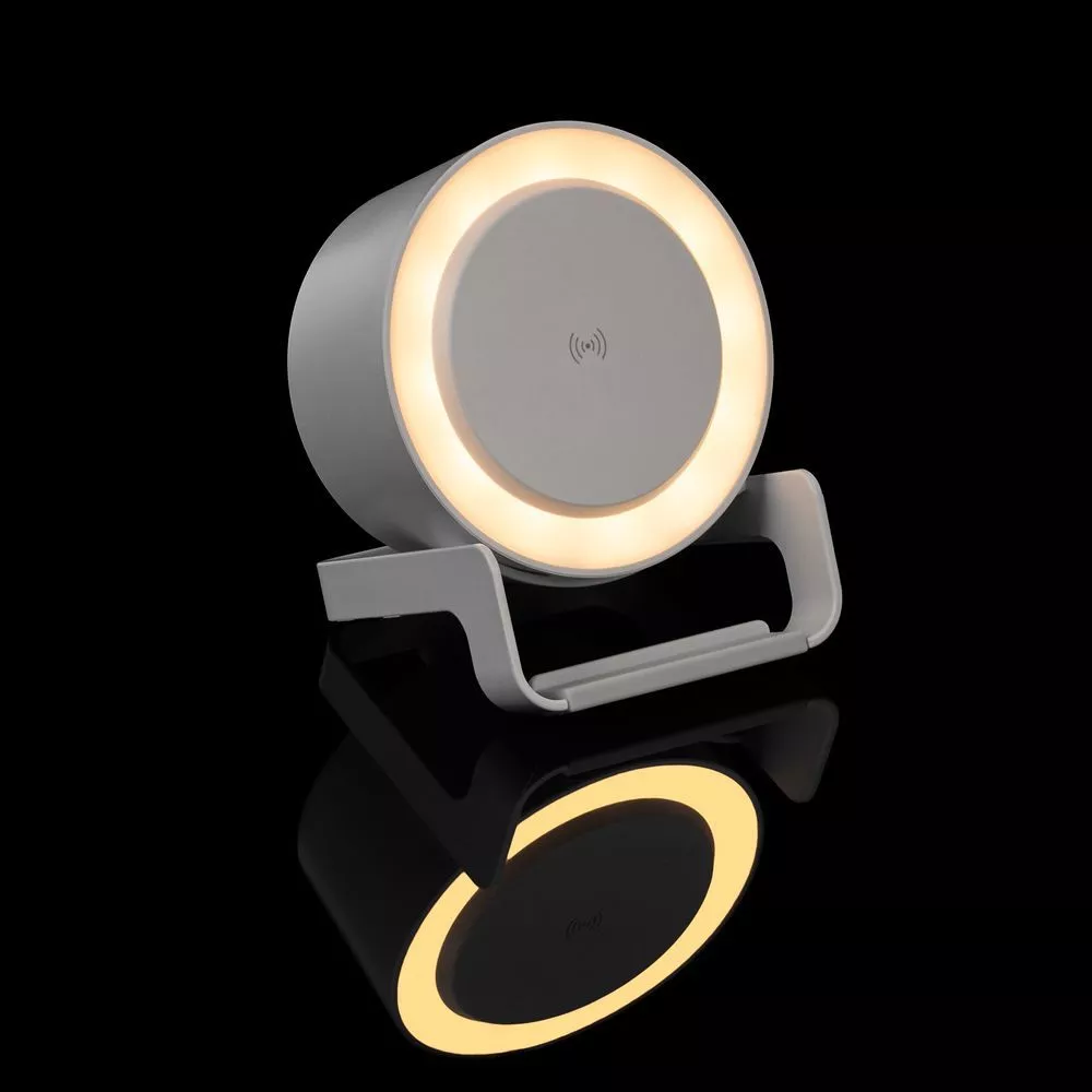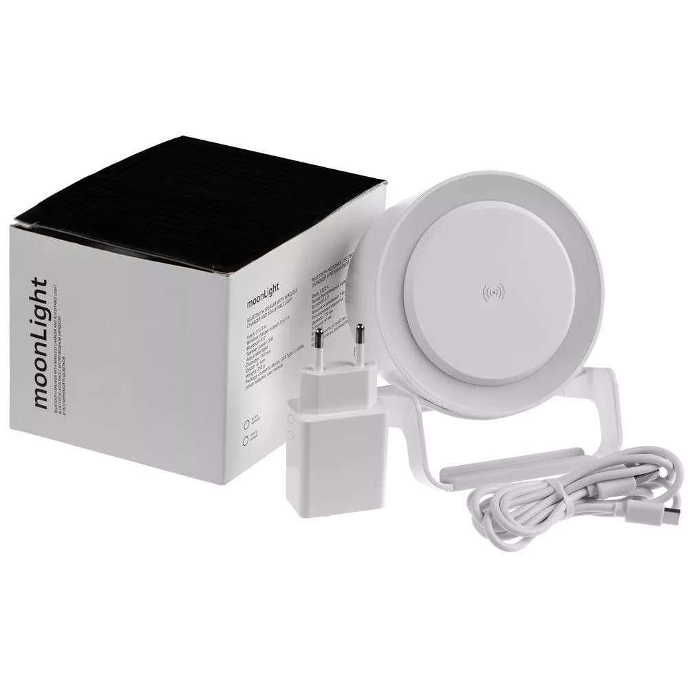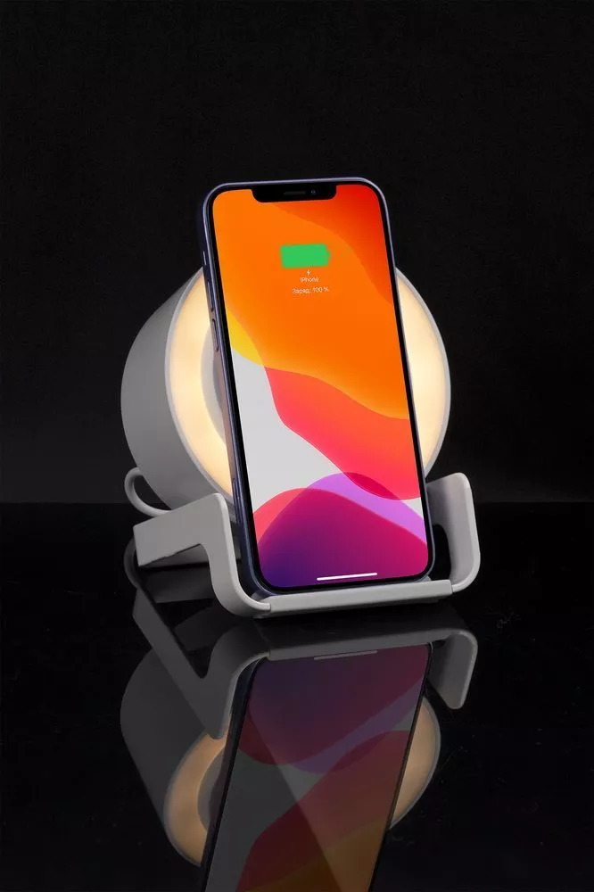 Устройство moonLight — это настольная лампа с bluetooth-колонкой и беспроводной зарядкой, также может служить в качестве ночника на прикроватном столике.
