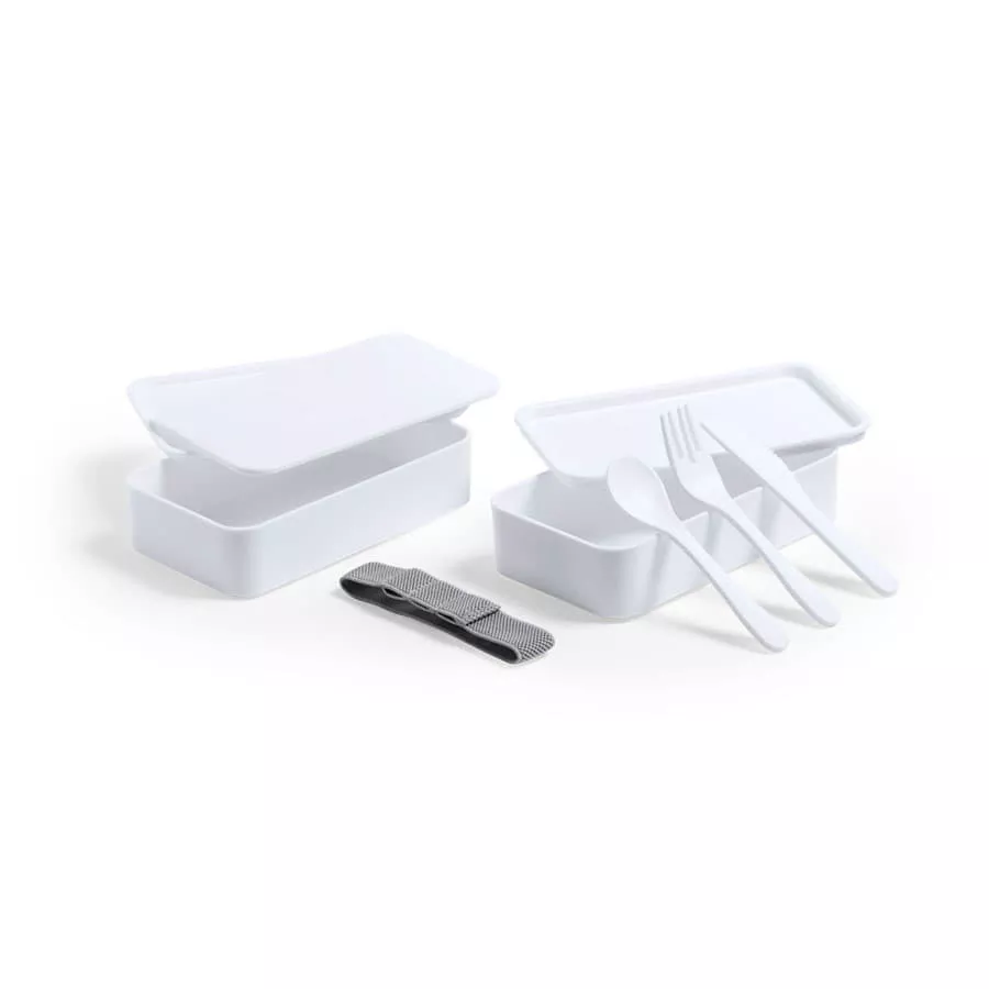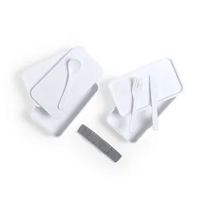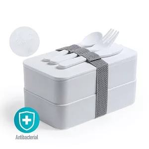 Ланч-бокс с двумя контейнерами, крышками и столовыми приборами: ложка, вилка, нож. Они крепятся на специальной резинке на корпусе изделия. Ланч-бокс изготовлен из особого антибактериального пластика (BPA free) и упакован в специальный пакет. Пластик с антибактериальной обработкой снижает уровень бактерий, присутствующих на поверхностях, благодаря добавлению постоянных статических микробных агентов, с высокой эффективностью предотвращающих бактериальное загрязнение. Изделие соответствует стандарту ISO 22196, который определяет антибактериальную активность в пластичных материалах и непористых поверхностях.