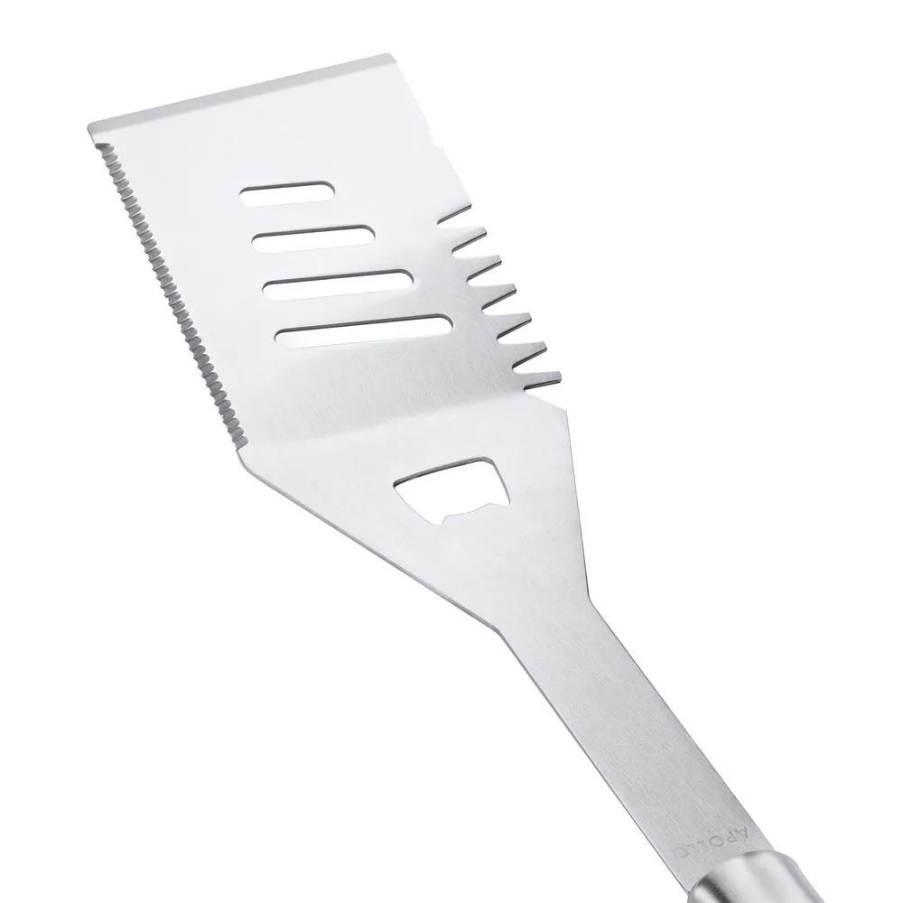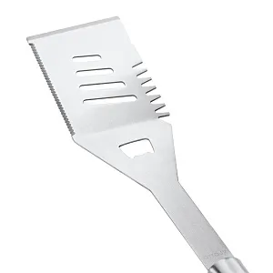 Лопатка предназначена для переворачивания продуктов на гриле, мангале или жаровне. Прорези на лопатке позволяют стекать излишкам масла, соуса или жидкостей. Рабочая часть лопатки изготовлена из нержавеющей стали и выдерживает высокие температуры. Изделие имеет оптимальную длину для безопасного использования, рукоятку с противоскользящим покрытием и петлю для подвешивания.