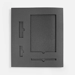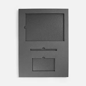 Ложемент, изготовленный из материала Izolon 500 черного цвета, представляет собой многослойную конструкцию, состоящую из нижнего слоя толщиной 5 мм и верхнего слоя толщиной 10 мм. В соответствии с утвержденным макетом, проемы для размещения предметов могут быть спроектированы как в одном, так и в обоих слоях.