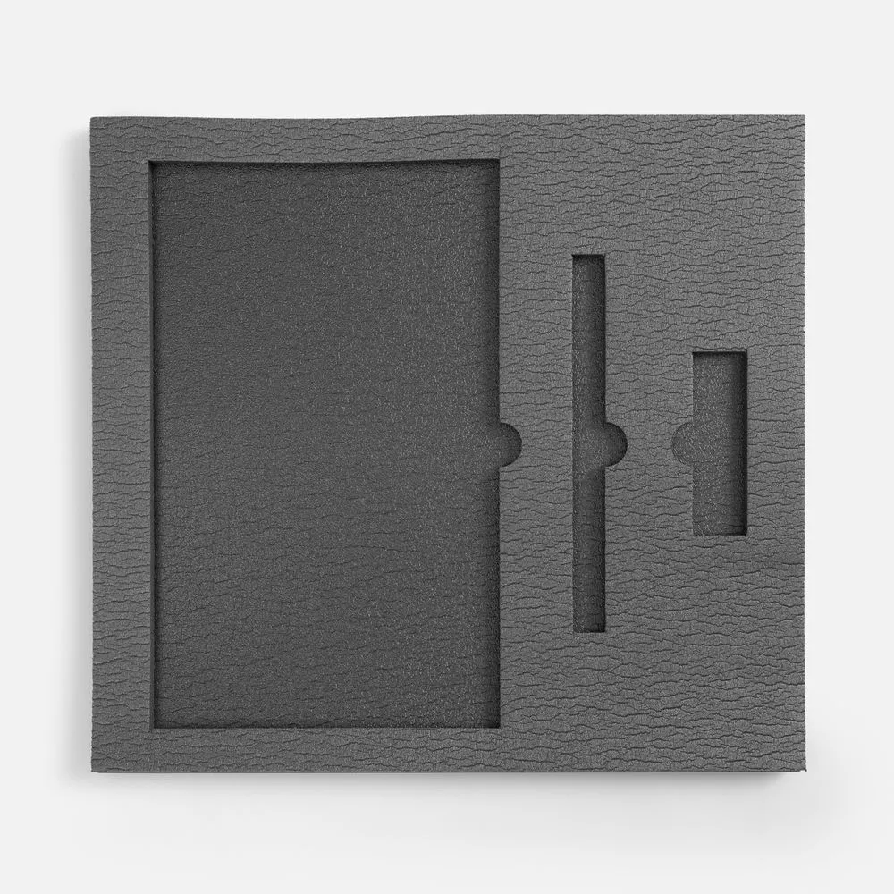 Ложемент, изготовленный из материала Izolon 500 черного цвета, представляет собой многослойную конструкцию, состоящую из нижнего слоя толщиной 5 мм и верхнего слоя толщиной 10 мм. В соответствии с утвержденным макетом, проемы для размещения предметов могут быть спроектированы как в одном, так и в обоих слоях.