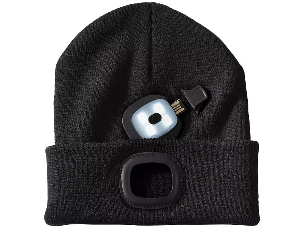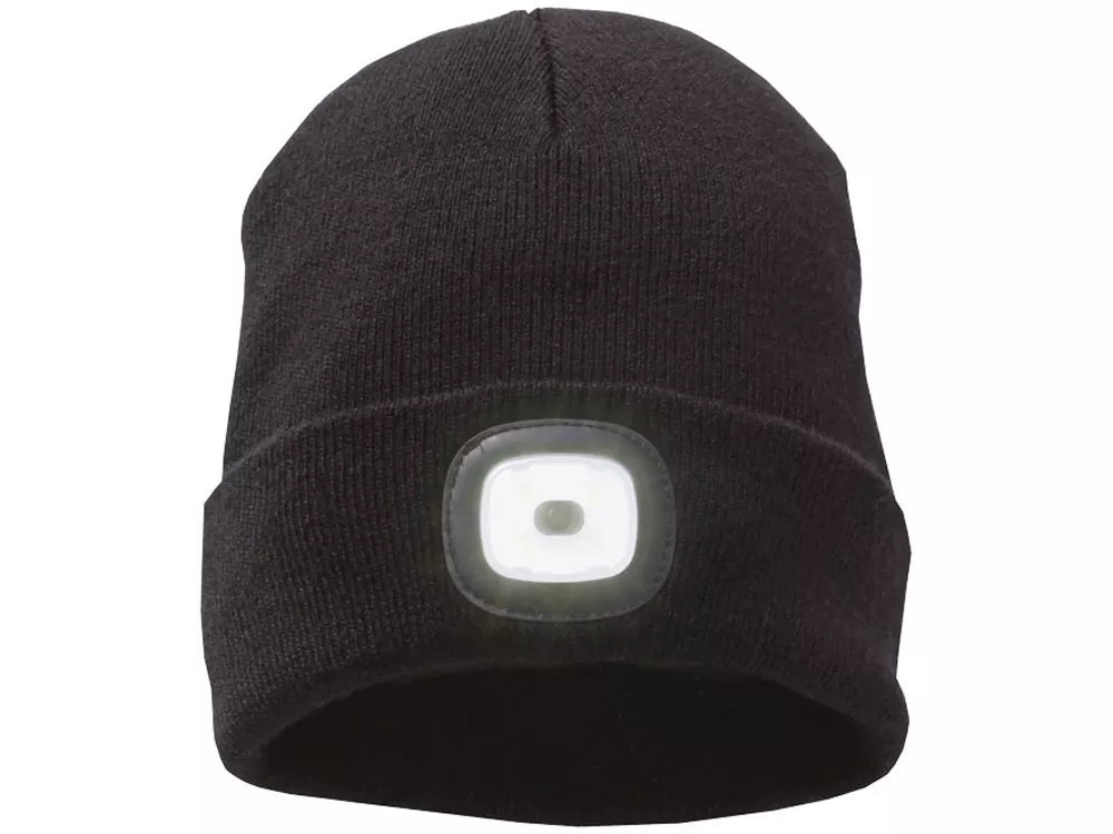 Двухслойная лыжная шапочка. Шапка с заворотом. Узор в форме дротика для плотного прилегания. Съемный и перезаряжаемый фонарь.